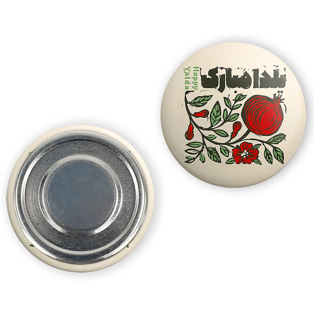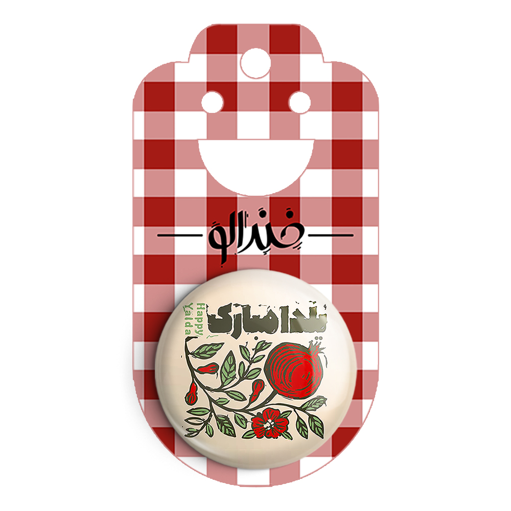 مگنت شب یلدا خندالو با روکش سلفون مات مخملی ضدخش و قطعه پشتی فلزی تولید شده است که آهنربای اتمی بکار برده شده در محصول، بصورت مخفی تعبیه شده ودیده نمی شود. ضمن اینکه گیرایی بسیار بالایی داشته و به هیچ عنوان از روی یخچال نمی افتد.