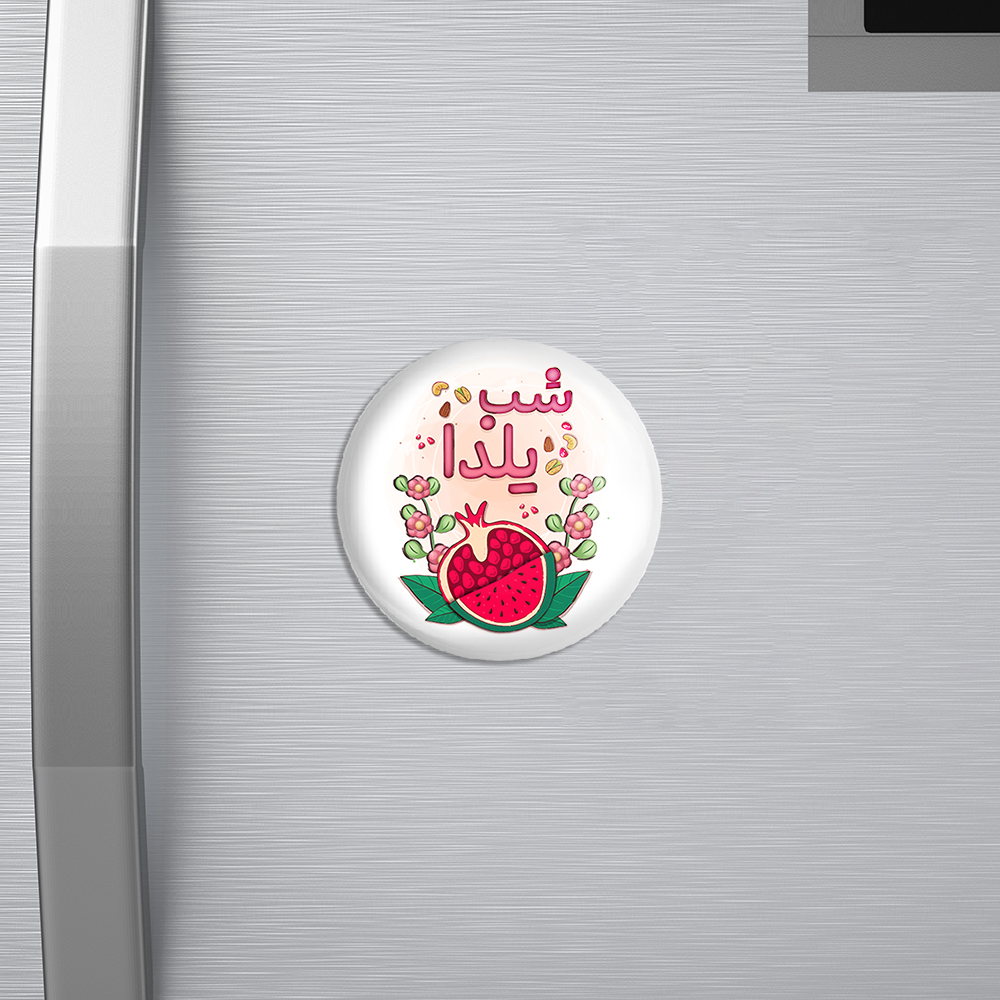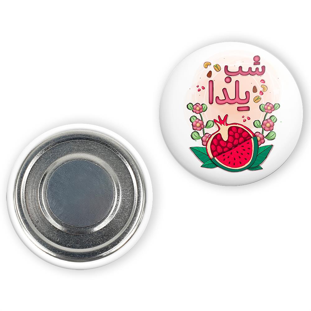 مگنت شب یلدا خندالو با روکش سلفون مات مخملی ضدخش و قطعه پشتی فلزی تولید شده است که آهنربای اتمی بکار برده شده در محصول، بصورت مخفی تعبیه شده ودیده نمی شود. ضمن اینکه گیرایی بسیار بالایی داشته و به هیچ عنوان از روی یخچال نمی افتد.
