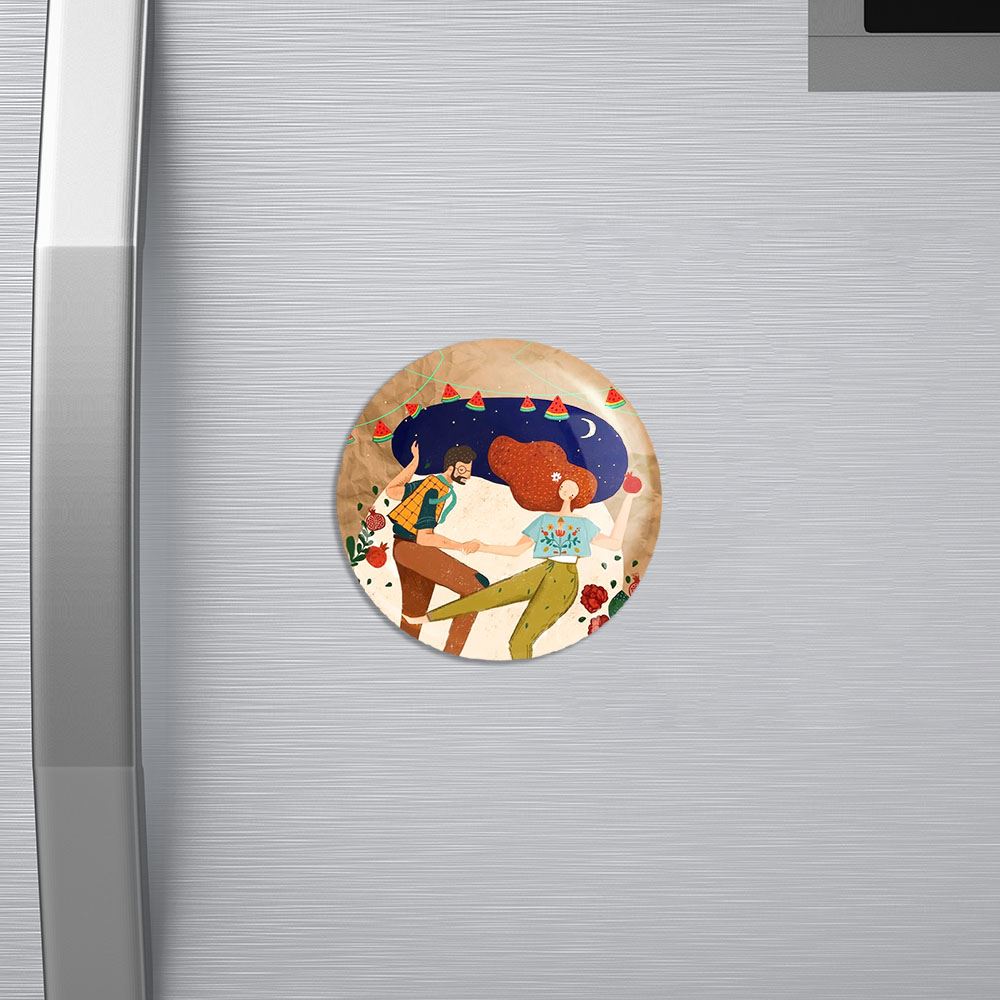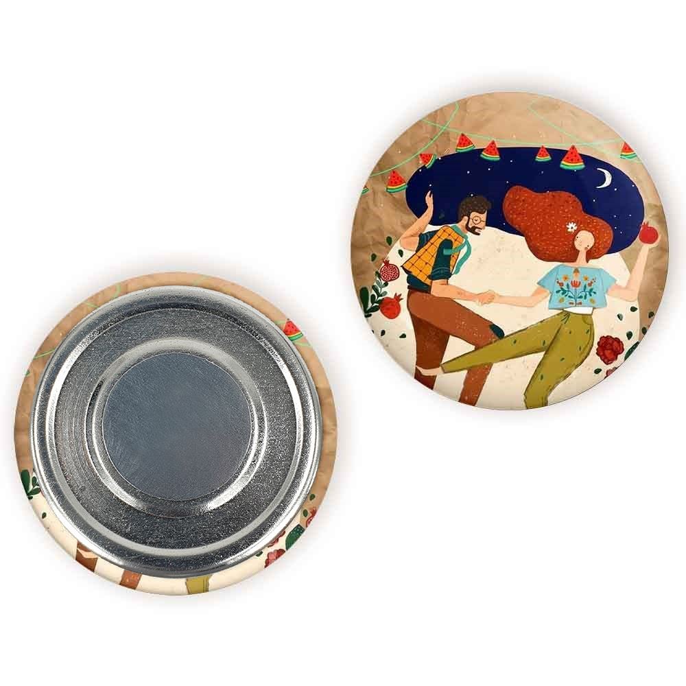 مگنت شب یلدا خندالو با روکش سلفون مات مخملی ضدخش و قطعه پشتی فلزی تولید شده است که آهنربای اتمی بکار برده شده در محصول، بصورت مخفی تعبیه شده ودیده نمی شود. ضمن اینکه گیرایی بسیار بالایی داشته و به هیچ عنوان از روی یخچال نمی افتد.