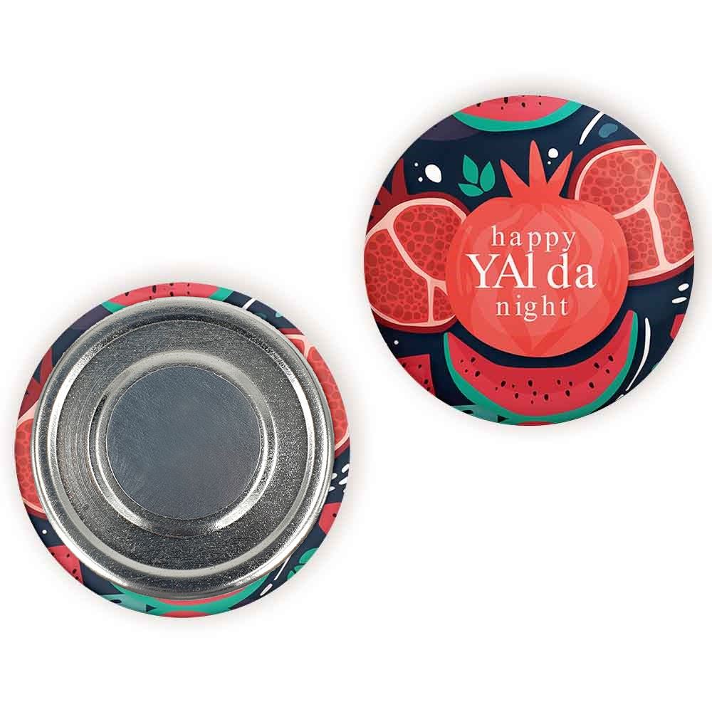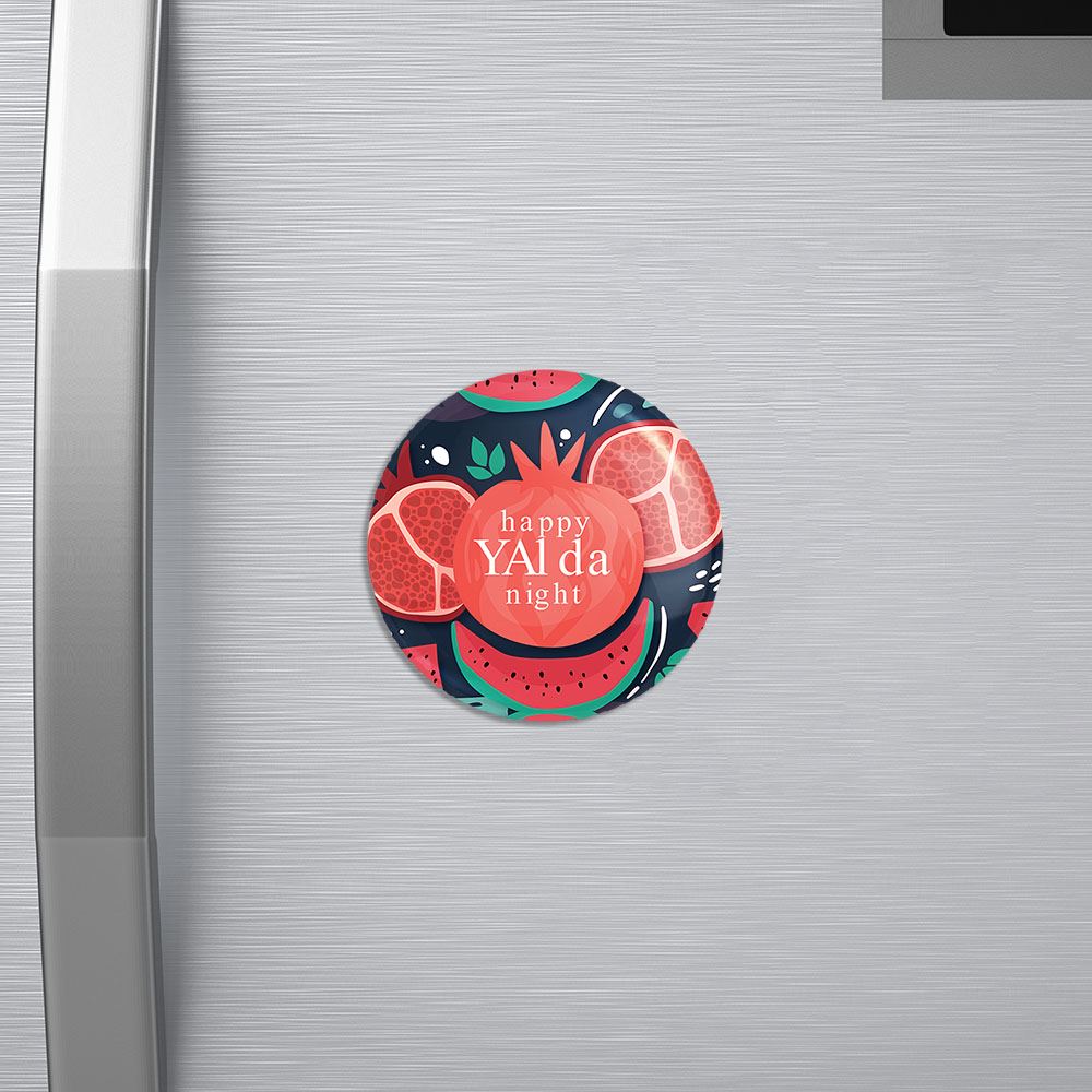 مگنت شب یلدا خندالو با روکش سلفون مات مخملی ضدخش و قطعه پشتی فلزی تولید شده است که آهنربای اتمی بکار برده شده در محصول، بصورت مخفی تعبیه شده ودیده نمی شود. ضمن اینکه گیرایی بسیار بالایی داشته و به هیچ عنوان از روی یخچال نمی افتد.