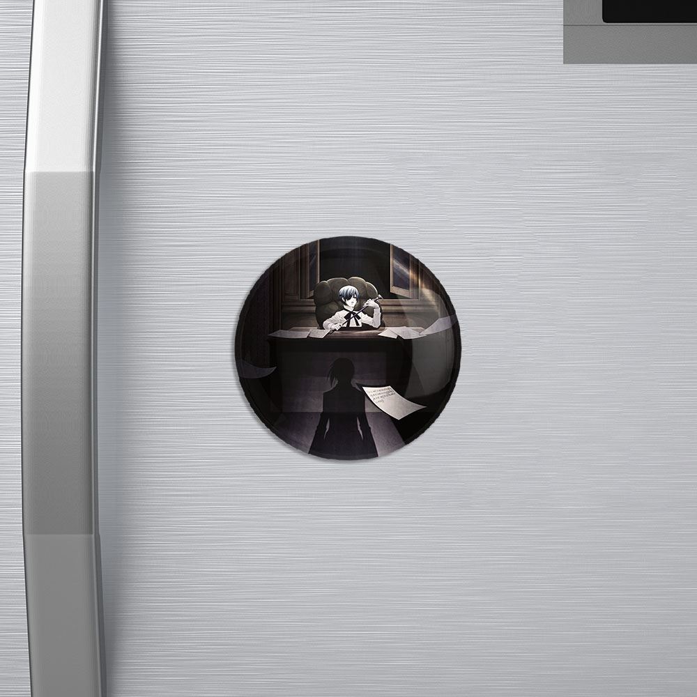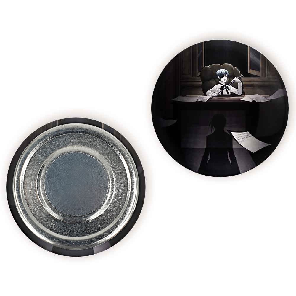 مگنت شیل انیمه خادم سیاه Black Butler خندالو با روکش سلفون مات مخملی ضدخش و قطعه پشتی فلزی تولید شده است که آهنربای اتمی بکار برده شده در محصول، بصورت مخفی تعبیه شده ودیده نمی شود. ضمن اینکه گیرایی بسیار بالایی داشته و به هیچ عنوان از روی یخچال نمی افتد.