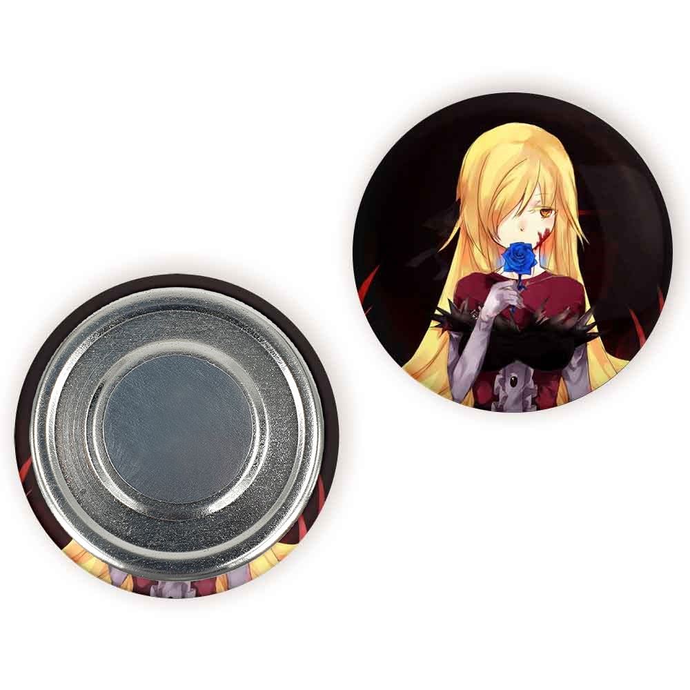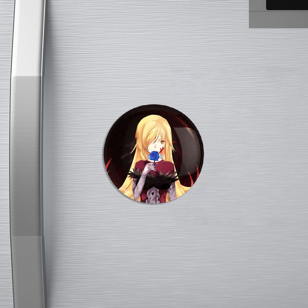 مگنت شینوبو اوشینو انیمه مونوگاتاری خندالو با روکش سلفون مات مخملی ضدخش و قطعه پشتی فلزی تولید شده است که آهنربای اتمی بکار برده شده در محصول، بصورت مخفی تعبیه شده ودیده نمی شود. ضمن اینکه گیرایی بسیار بالایی داشته و به هیچ عنوان از روی یخچال نمی افتد.