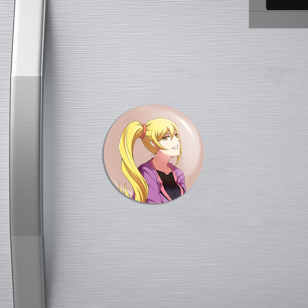 مگنت شینوبو اوشینو انیمه مونوگاتاری خندالو با روکش سلفون مات مخملی ضدخش و قطعه پشتی فلزی تولید شده است که آهنربای اتمی بکار برده شده در محصول، بصورت مخفی تعبیه شده ودیده نمی شود. ضمن اینکه گیرایی بسیار بالایی داشته و به هیچ عنوان از روی یخچال نمی افتد.