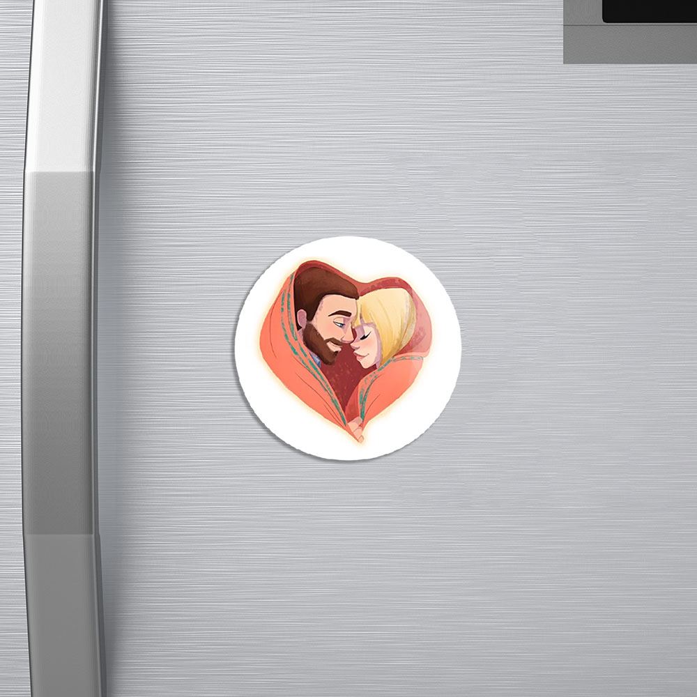 مگنت عاشقانه خندالو با روکش سلفون مات مخملی ضدخش و قطعه پشتی فلزی تولید شده است که آهنربای اتمی بکار برده شده در محصول، بصورت مخفی تعبیه شده ودیده نمی شود. ضمن اینکه گیرایی بسیار بالایی داشته و به هیچ عنوان از روی یخچال نمی افتد.
