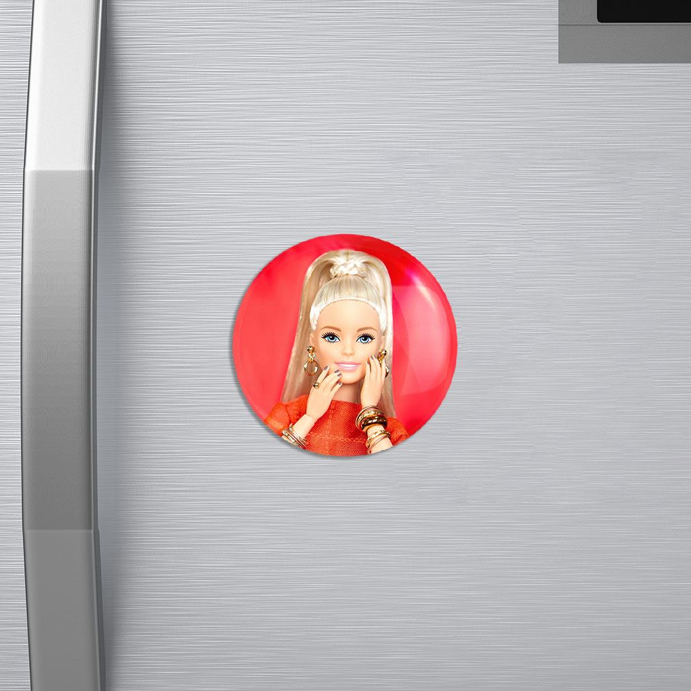 مگنت عروسک باربی خندالو با روکش سلفون مات مخملی ضدخش و قطعه پشتی فلزی تولید شده است که آهنربای اتمی بکار برده شده در محصول، بصورت مخفی تعبیه شده ودیده نمی شود. ضمن اینکه گیرایی بسیار بالایی داشته و به هیچ عنوان از روی یخچال نمی افتد.