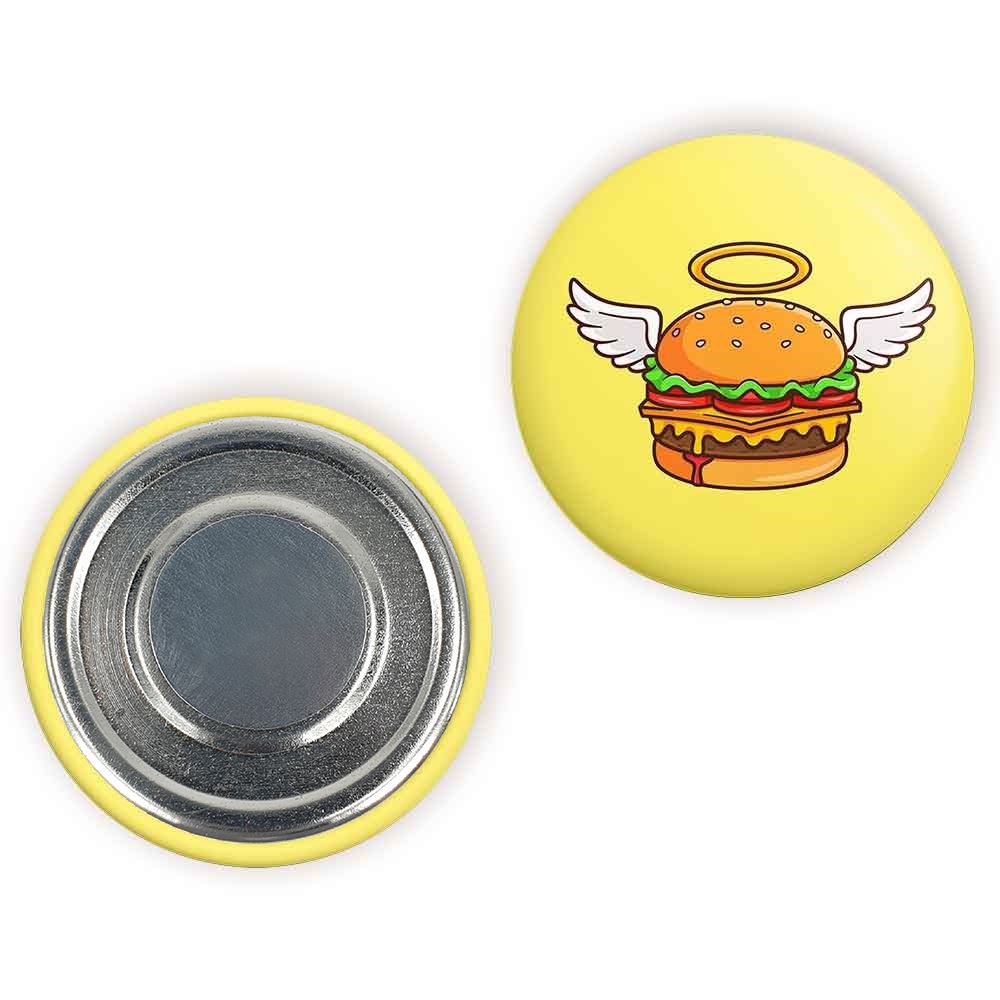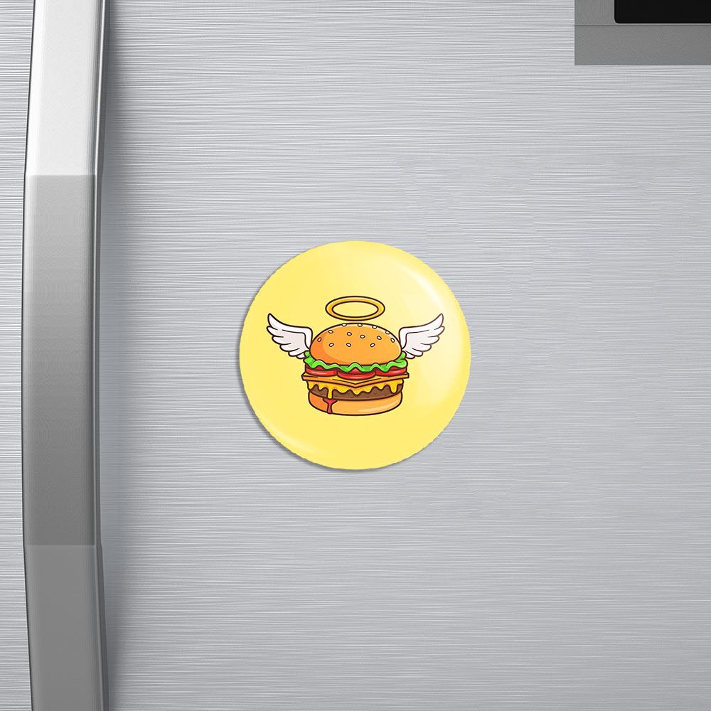 مگنت فست فود برگر خندالو با روکش سلفون مات مخملی ضدخش و قطعه پشتی فلزی تولید شده است که آهنربای اتمی بکار برده شده در محصول، بصورت مخفی تعبیه شده ودیده نمی شود. ضمن اینکه گیرایی بسیار بالایی داشته و به هیچ عنوان از روی یخچال نمی افتد.