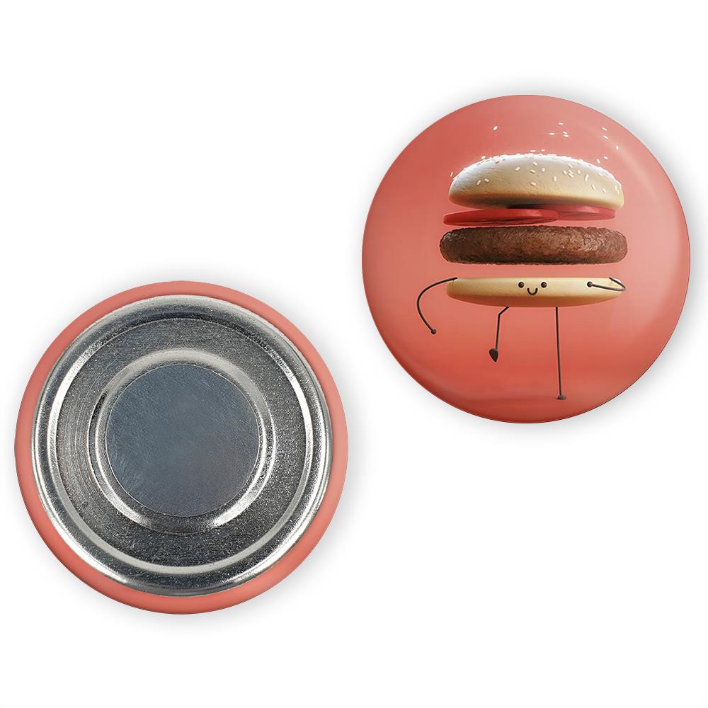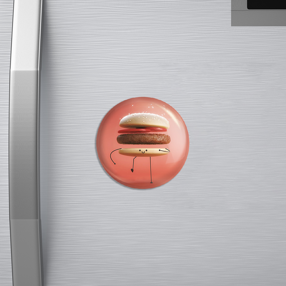 مگنت فست فود خندالو با روکش سلفون مات مخملی ضدخش و قطعه پشتی فلزی تولید شده است که آهنربای اتمی بکار برده شده در محصول، بصورت مخفی تعبیه شده ودیده نمی شود. ضمن اینکه گیرایی بسیار بالایی داشته و به هیچ عنوان از روی یخچال نمی افتد.