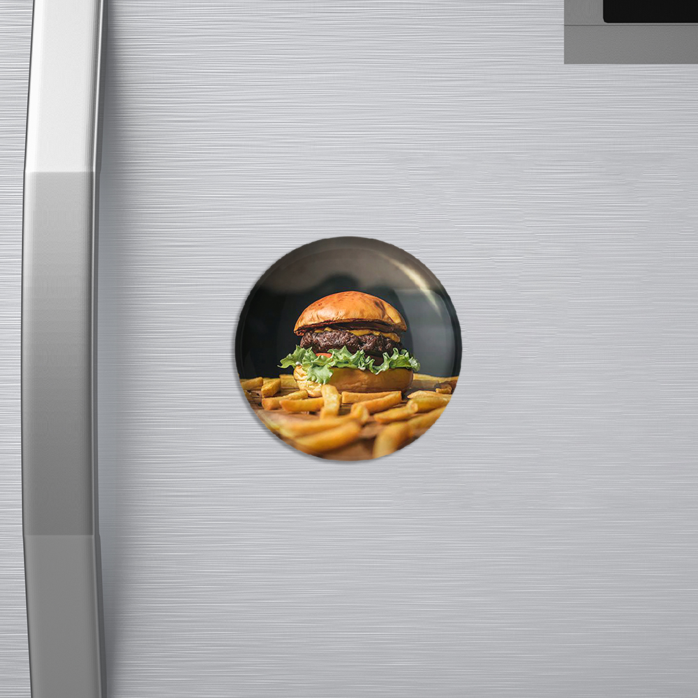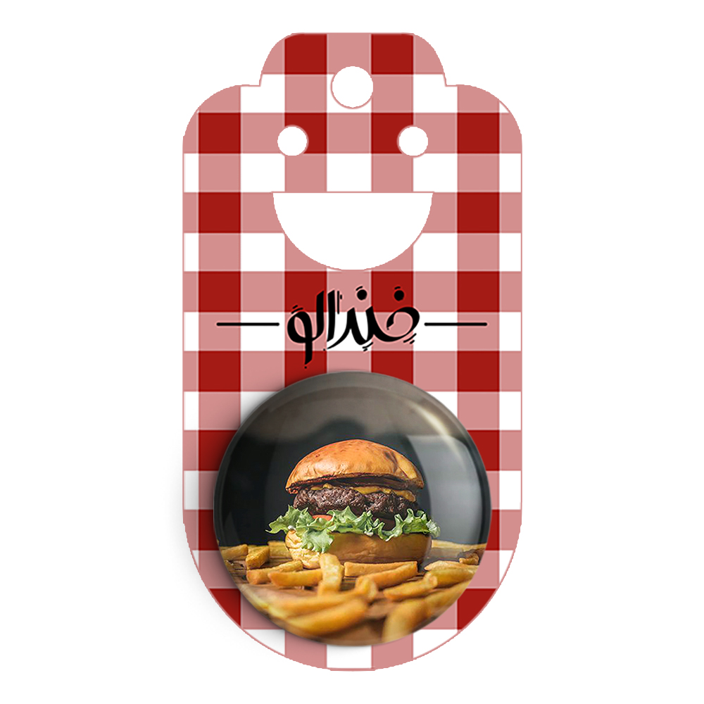 مگنت فست فود خندالو با روکش سلفون مات مخملی ضدخش و قطعه پشتی فلزی تولید شده است که آهنربای اتمی بکار برده شده در محصول، بصورت مخفی تعبیه شده ودیده نمی شود. ضمن اینکه گیرایی بسیار بالایی داشته و به هیچ عنوان از روی یخچال نمی افتد.