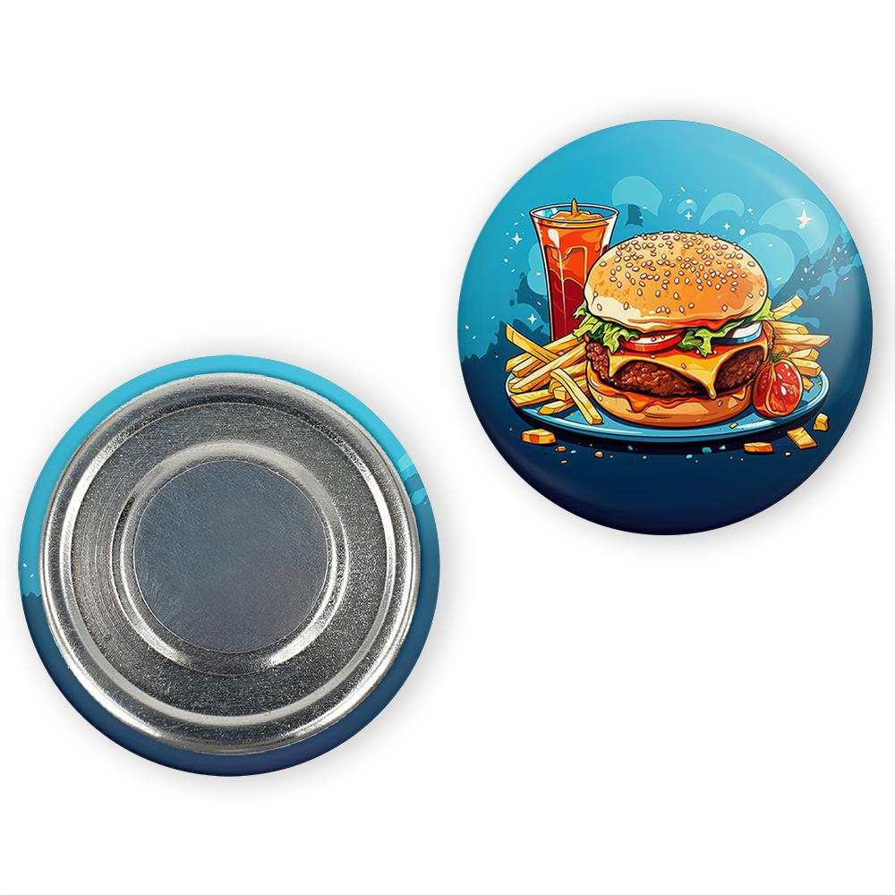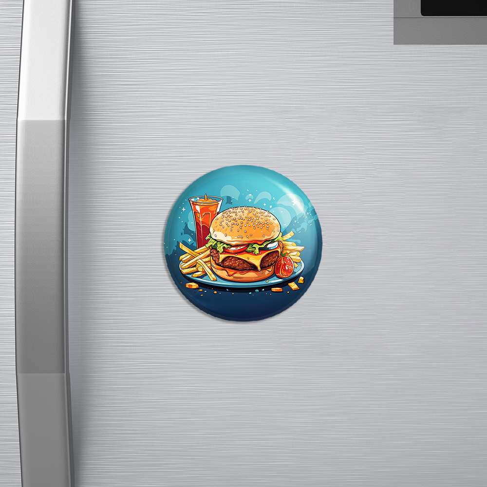 مگنت فست فود (Fast Food) خندالو با روکش سلفون مات مخملی ضدخش و قطعه پشتی فلزی تولید شده است که آهنربای اتمی بکار برده شده در محصول، بصورت مخفی تعبیه شده ودیده نمی شود. ضمن اینکه گیرایی بسیار بالایی داشته و به هیچ عنوان از روی یخچال نمی افتد.