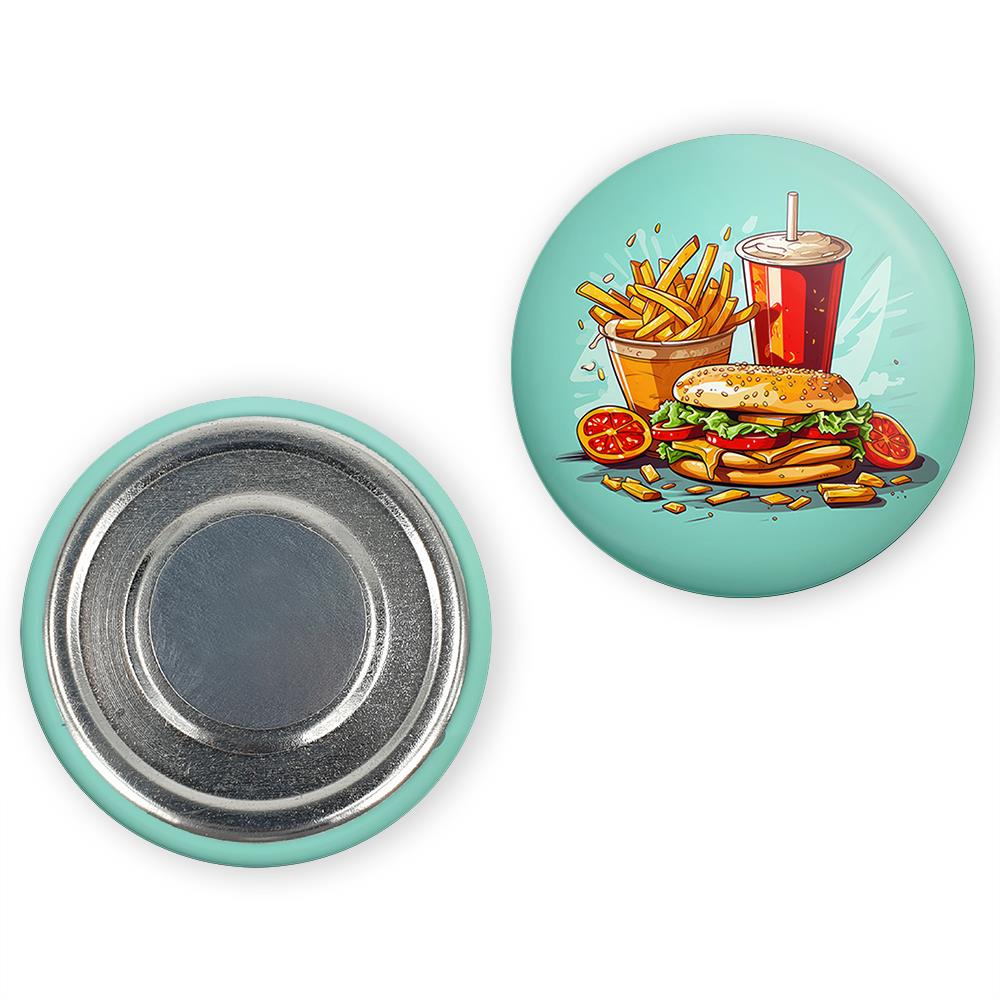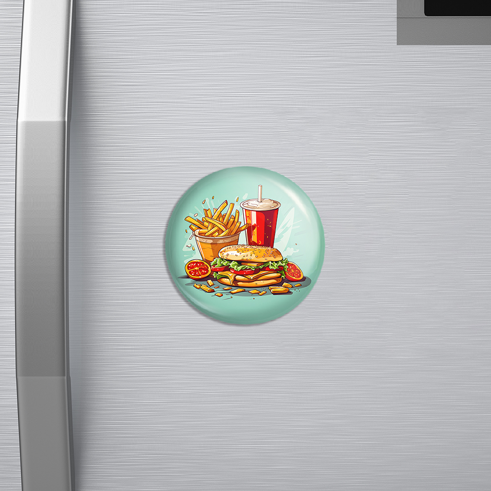 مگنت فست فود (Fast Food) خندالو با روکش سلفون مات مخملی ضدخش و قطعه پشتی فلزی تولید شده است که آهنربای اتمی بکار برده شده در محصول، بصورت مخفی تعبیه شده ودیده نمی شود. ضمن اینکه گیرایی بسیار بالایی داشته و به هیچ عنوان از روی یخچال نمی افتد.