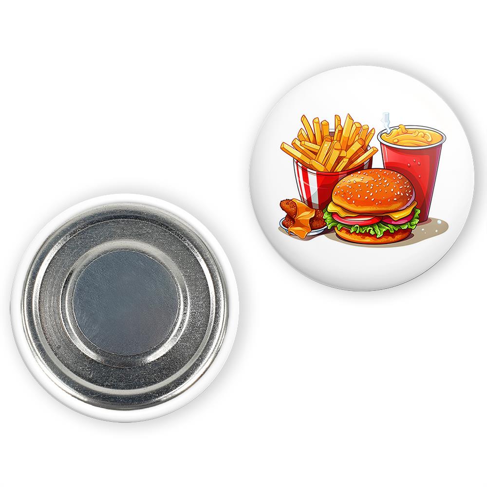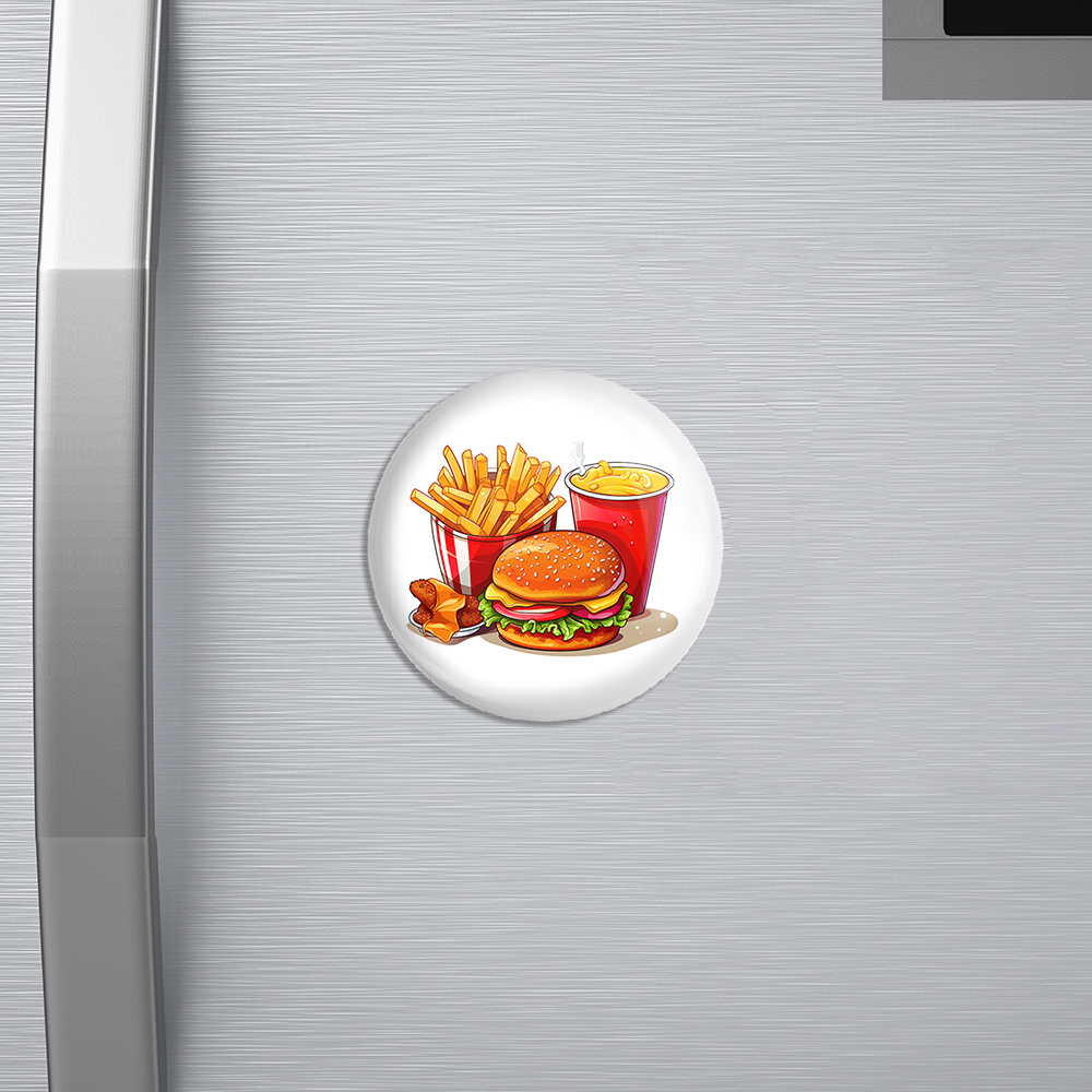 مگنت فست فود (Fast Food) خندالو با روکش سلفون مات مخملی ضدخش و قطعه پشتی فلزی تولید شده است که آهنربای اتمی بکار برده شده در محصول، بصورت مخفی تعبیه شده ودیده نمی شود. ضمن اینکه گیرایی بسیار بالایی داشته و به هیچ عنوان از روی یخچال نمی افتد.