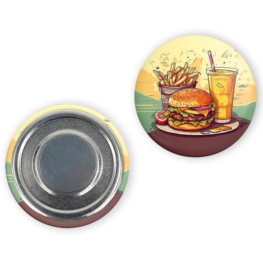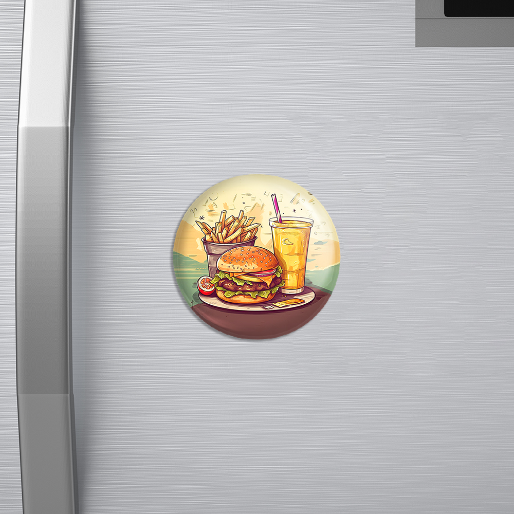 مگنت فست فود (Fast Food) خندالو با روکش سلفون مات مخملی ضدخش و قطعه پشتی فلزی تولید شده است که آهنربای اتمی بکار برده شده در محصول، بصورت مخفی تعبیه شده ودیده نمی شود. ضمن اینکه گیرایی بسیار بالایی داشته و به هیچ عنوان از روی یخچال نمی افتد.