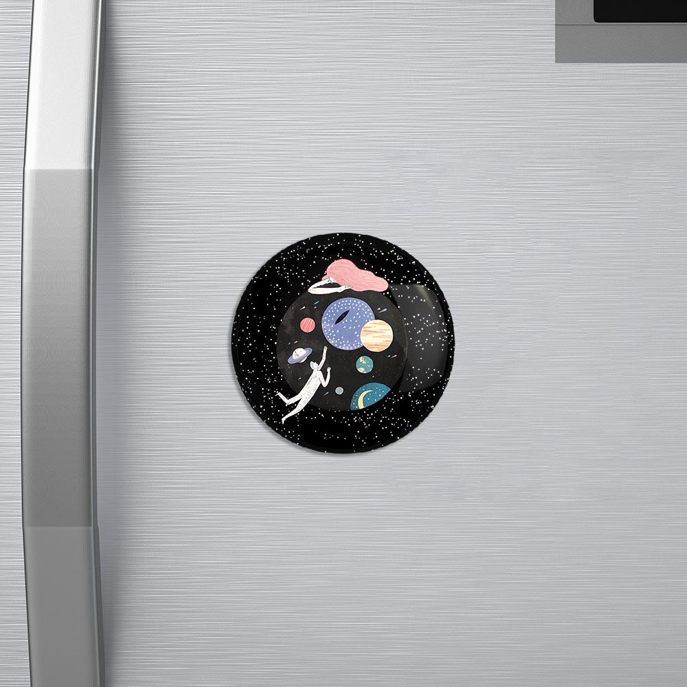 مگنت فضایی خندالو با روکش سلفون مات مخملی ضدخش و قطعه پشتی فلزی تولید شده است که آهنربای اتمی بکار برده شده در محصول، بصورت مخفی تعبیه شده ودیده نمی شود. ضمن اینکه گیرایی بسیار بالایی داشته و به هیچ عنوان از روی یخچال نمی افتد.