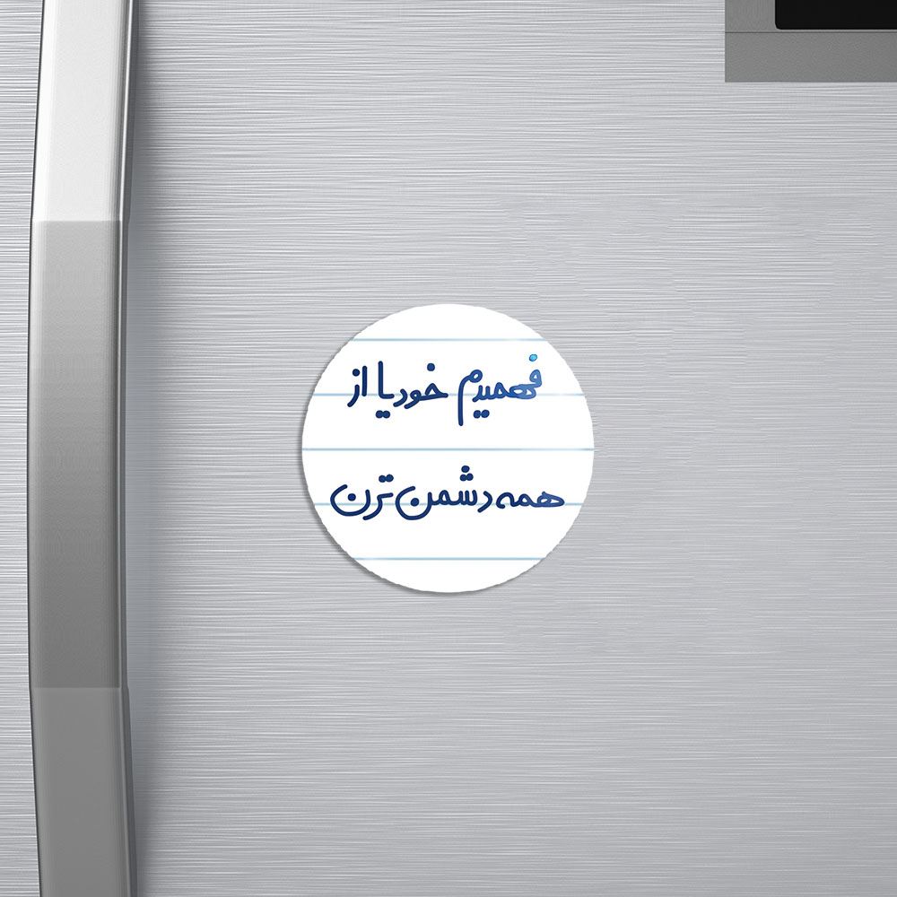 مگنت فهمیدم خودیا از همه دشمن ترن خندالو با روکش سلفون مات مخملی ضدخش و قطعه پشتی فلزی تولید شده است که آهنربای اتمی بکار برده شده در محصول، بصورت مخفی تعبیه شده ودیده نمی شود. ضمن اینکه گیرایی بسیار بالایی داشته و به هیچ عنوان از روی یخچال نمی افتد. نکته مهم این است که به دلیل مخفی بودن آهنربا، هیچگونه خط و خش و زدگی بر روی یخچال ایجاد نخواهد شد. چاپ مگنت یخچال فهمیدم خودیا از همه دشمن ترن نیز با دستگاه های استاندارد و با بهترین سطح کیفیت صورت گرفته و طرح با شفافیتی مثال زدنی و با سلفون چسبی تولید شده است که باعث شده محصول نهایی بدون شکست نور دیده شود. همچنین بسته بندی جذاب و مینیمال مگنت های یخچالی، آنها را مناسب هدیه کرده است. مگنت فهمیدم خودیا از همه دشمن ترن خندالو علاوه بر روی یخچال بر هر سطح فلزی دیگری مثل لولای در اتاق، کمد های آهنی و … نیز قابل نصب است.