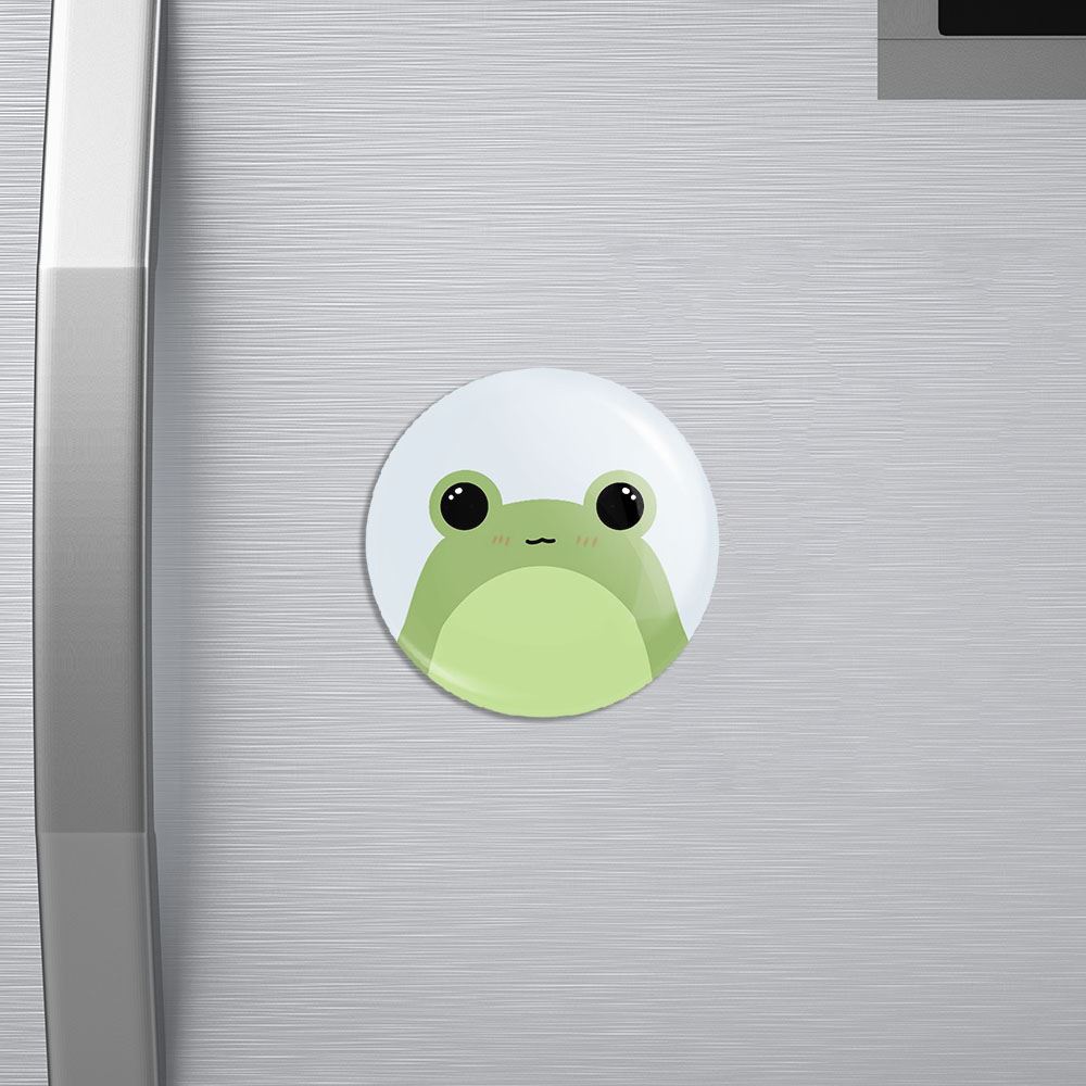 مگنت قورباغه خندالو با روکش سلفون مات مخملی ضدخش و قطعه پشتی فلزی تولید شده است که آهنربای اتمی بکار برده شده در محصول، بصورت مخفی تعبیه شده ودیده نمی شود. ضمن اینکه گیرایی بسیار بالایی داشته و به هیچ عنوان از روی یخچال نمی افتد.