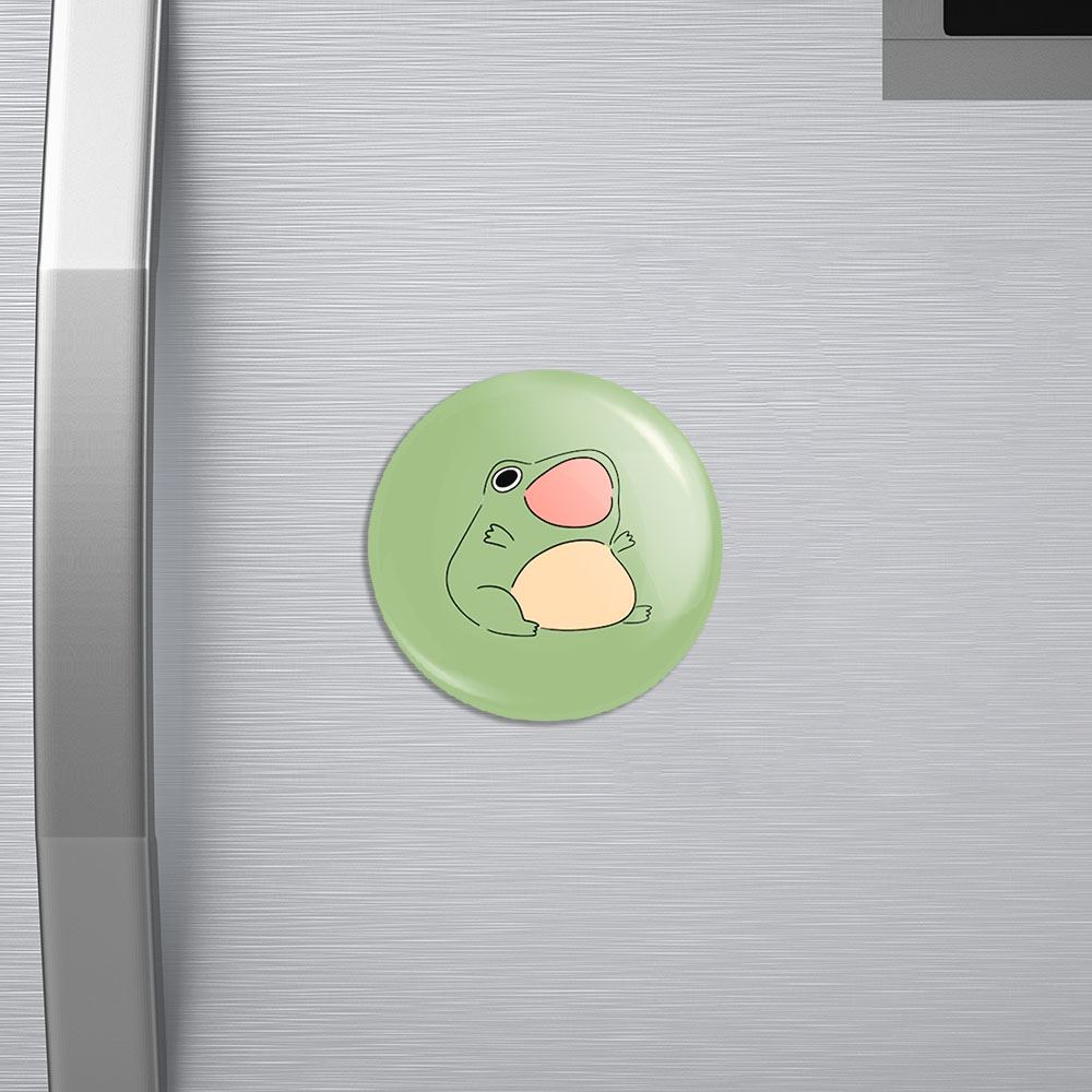 مگنت قورباغه خندالو با روکش سلفون مات مخملی ضدخش و قطعه پشتی فلزی تولید شده است که آهنربای اتمی بکار برده شده در محصول، بصورت مخفی تعبیه شده ودیده نمی شود. ضمن اینکه گیرایی بسیار بالایی داشته و به هیچ عنوان از روی یخچال نمی افتد.
