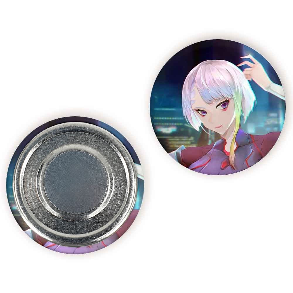 مگنت لوسی انیمه سایبرپانک خندالو با روکش سلفون مات مخملی ضدخش و قطعه پشتی فلزی تولید شده است که آهنربای اتمی بکار برده شده در محصول، بصورت مخفی تعبیه شده ودیده نمی شود. ضمن اینکه گیرایی بسیار بالایی داشته و به هیچ عنوان از روی یخچال نمی افتد.