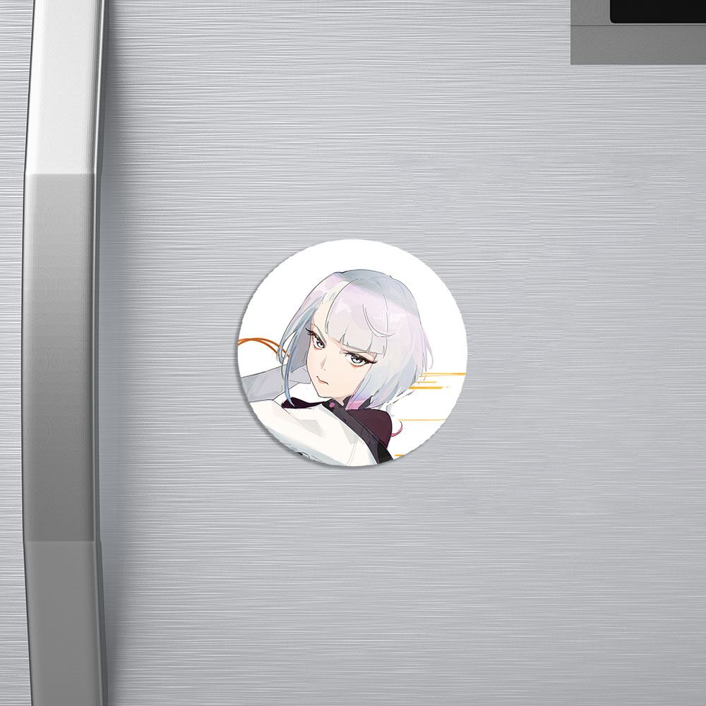 مگنت لوسی انیمه سایبرپانک خندالو با روکش سلفون مات مخملی ضدخش و قطعه پشتی فلزی تولید شده است که آهنربای اتمی بکار برده شده در محصول، بصورت مخفی تعبیه شده ودیده نمی شود. ضمن اینکه گیرایی بسیار بالایی داشته و به هیچ عنوان از روی یخچال نمی افتد.