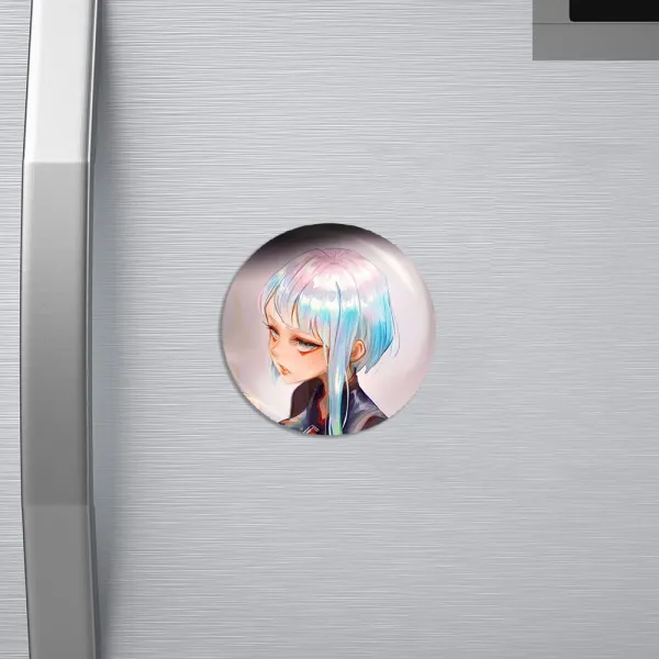 مگنت لوسی انیمه سایبرپانک خندالو با روکش سلفون مات مخملی ضدخش و قطعه پشتی فلزی تولید شده است که آهنربای اتمی بکار برده شده در محصول، بصورت مخفی تعبیه شده ودیده نمی شود. ضمن اینکه گیرایی بسیار بالایی داشته و به هیچ عنوان از روی یخچال نمی افتد.