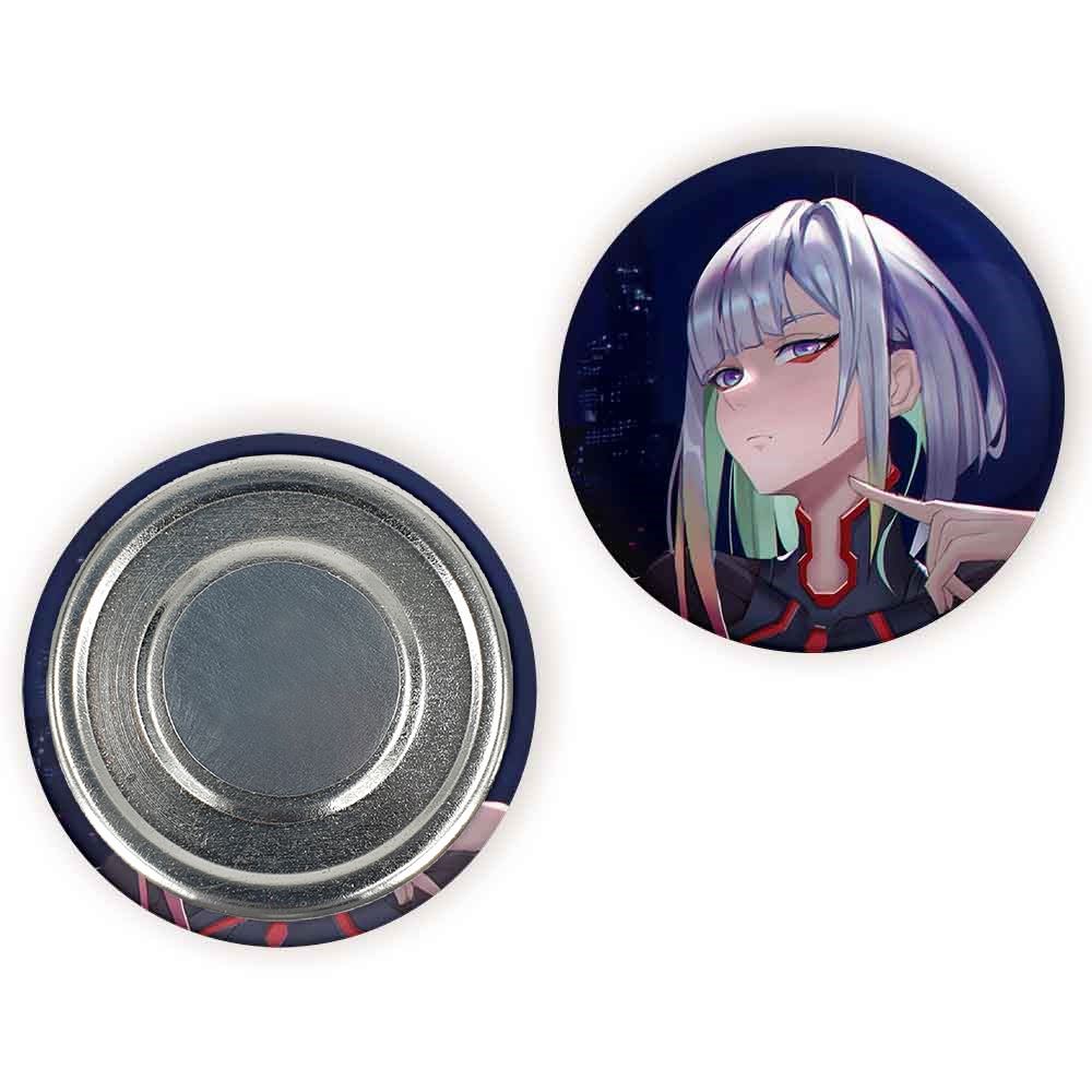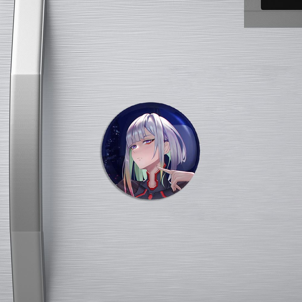 مگنت لوسی انیمه سایبرپانک خندالو با روکش سلفون مات مخملی ضدخش و قطعه پشتی فلزی تولید شده است که آهنربای اتمی بکار برده شده در محصول، بصورت مخفی تعبیه شده ودیده نمی شود. ضمن اینکه گیرایی بسیار بالایی داشته و به هیچ عنوان از روی یخچال نمی افتد.