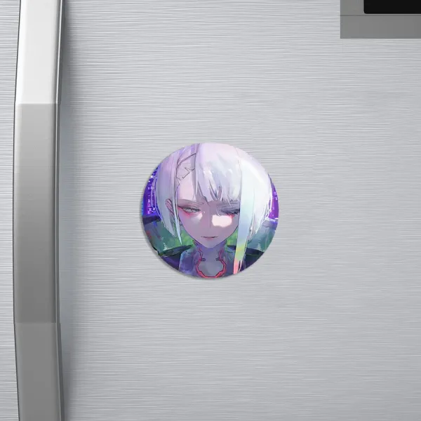 مگنت لوسی انیمه سایبرپانک خندالو با روکش سلفون مات مخملی ضدخش و قطعه پشتی فلزی تولید شده است که آهنربای اتمی بکار برده شده در محصول، بصورت مخفی تعبیه شده ودیده نمی شود. ضمن اینکه گیرایی بسیار بالایی داشته و به هیچ عنوان از روی یخچال نمی افتد.