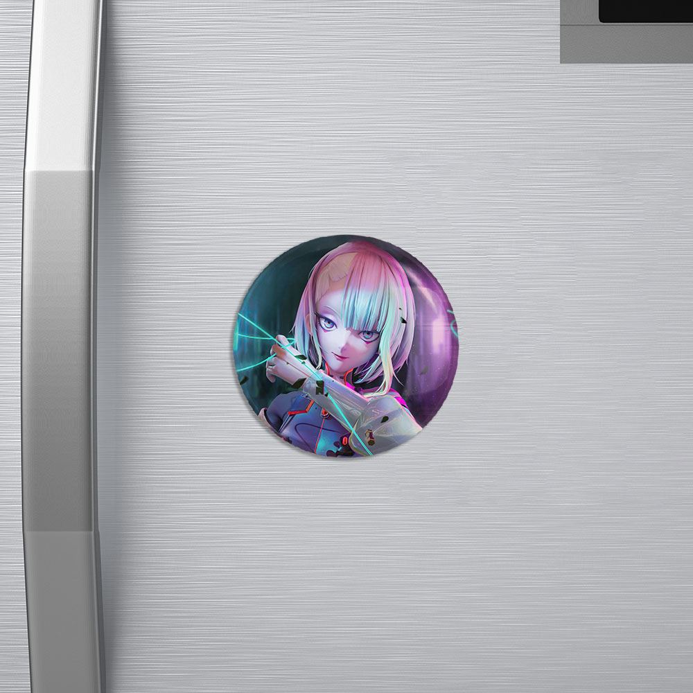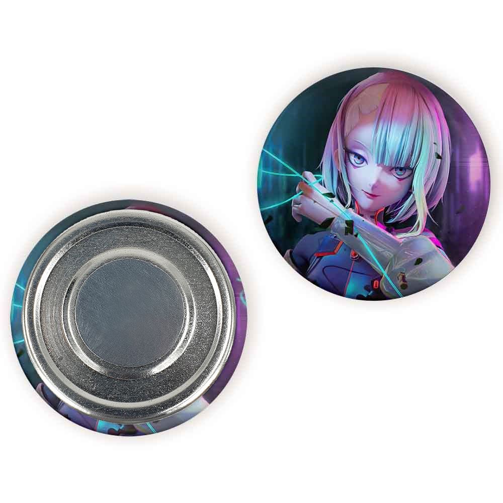 مگنت لوسی انیمه سایبرپانک خندالو با روکش سلفون مات مخملی ضدخش و قطعه پشتی فلزی تولید شده است که آهنربای اتمی بکار برده شده در محصول، بصورت مخفی تعبیه شده ودیده نمی شود. ضمن اینکه گیرایی بسیار بالایی داشته و به هیچ عنوان از روی یخچال نمی افتد.
