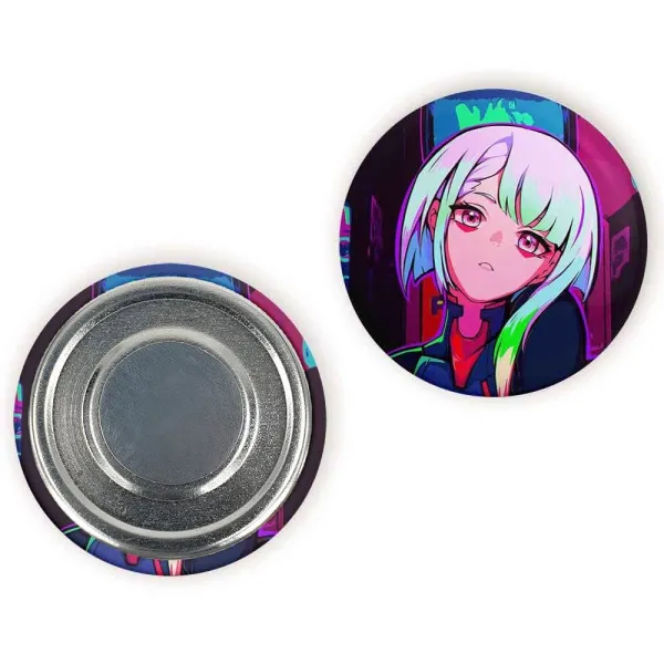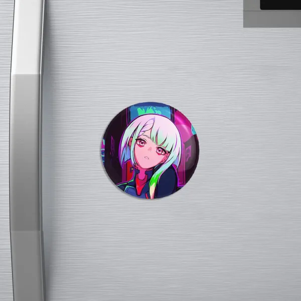 مگنت لوسی انیمه سایبر پانک Cyberpunk خندالو با روکش سلفون مات مخملی ضدخش و قطعه پشتی فلزی تولید شده است که آهنربای اتمی بکار برده شده در محصول، بصورت مخفی تعبیه شده ودیده نمی شود. ضمن اینکه گیرایی بسیار بالایی داشته و به هیچ عنوان از روی یخچال نمی افتد.