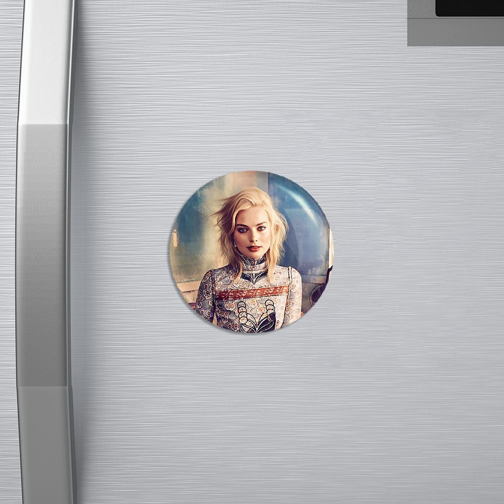 مگنت مارگو رابی Margot Robbie خندالو با روکش سلفون مات مخملی ضدخش و قطعه پشتی فلزی تولید شده است که آهنربای اتمی بکار برده شده در محصول، بصورت مخفی تعبیه شده ودیده نمی شود. ضمن اینکه گیرایی بسیار بالایی داشته و به هیچ عنوان از روی یخچال نمی افتد.