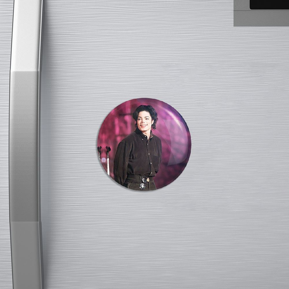 مگنت مایکل جکسون Michael Jackson خندالو با روکش سلفون مات مخملی ضدخش و قطعه پشتی فلزی تولید شده است که آهنربای اتمی بکار برده شده در محصول، بصورت مخفی تعبیه شده ودیده نمی شود. ضمن اینکه گیرایی بسیار بالایی داشته و به هیچ عنوان از روی یخچال نمی افتد.