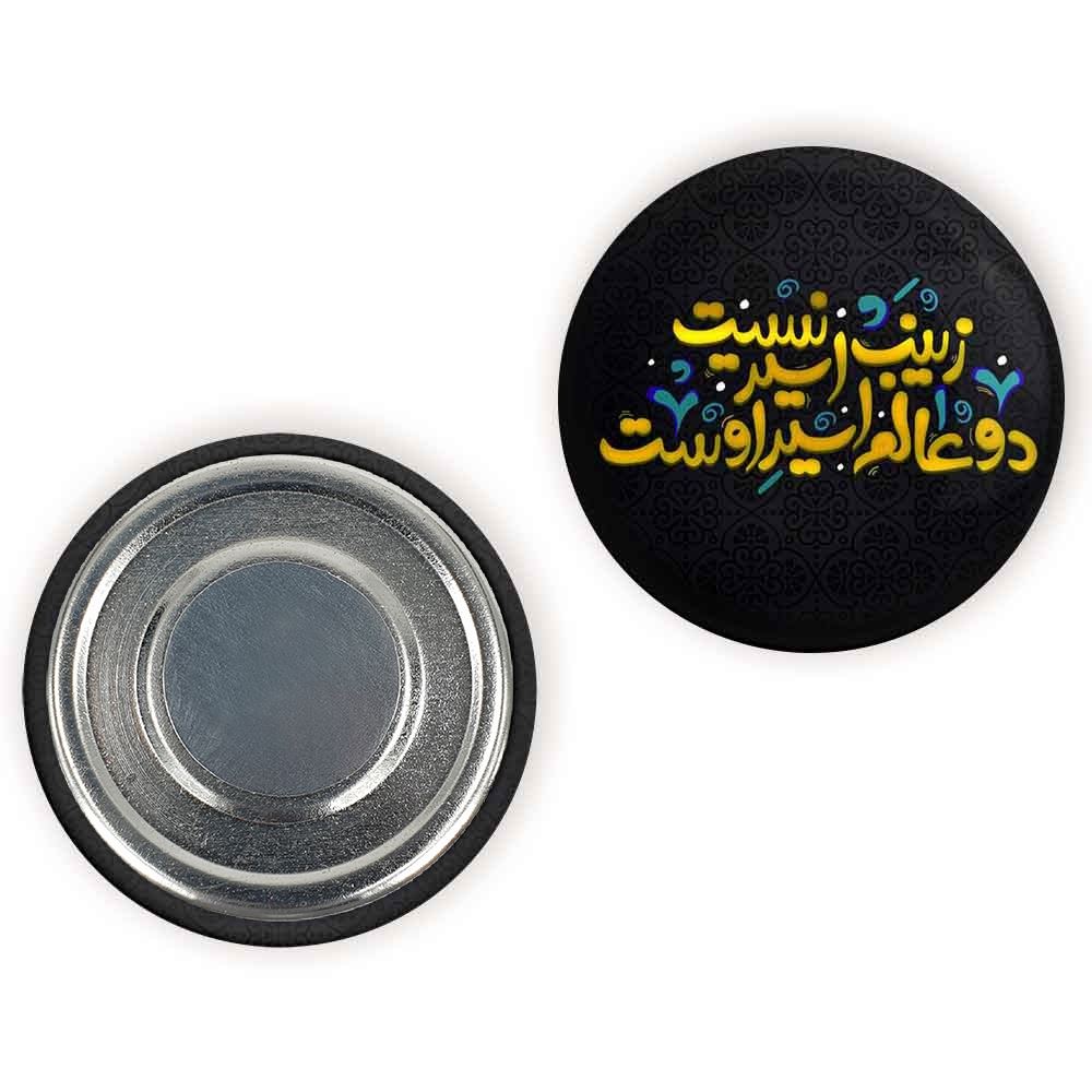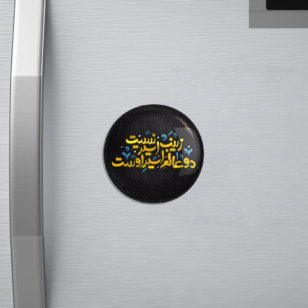 مگنت محرم زینب اسیر نیست دوعالم اسیر اوست خندالو با روکش سلفون مات مخملی ضدخش و قطعه پشتی فلزی تولید شده است که آهنربای اتمی بکار برده شده در محصول، بصورت مخفی تعبیه شده ودیده نمی شود. ضمن اینکه گیرایی بسیار بالایی داشته و به هیچ عنوان از روی یخچال نمی افتد.