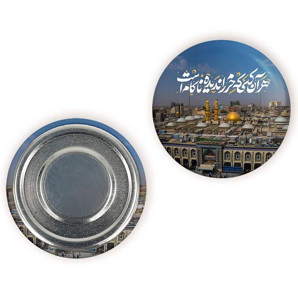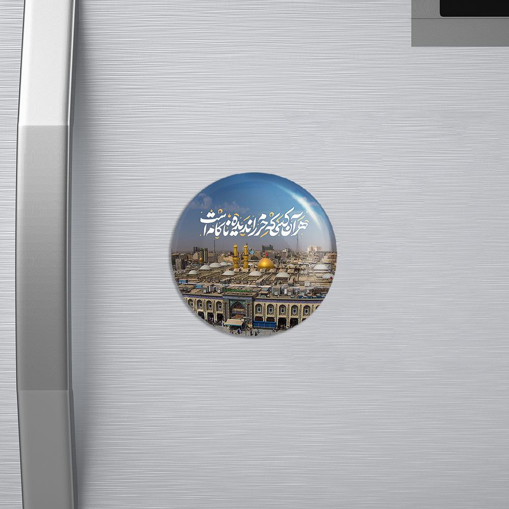 مگنت محرم هر آن کسی که حرم را ندیده ناکام است خندالو با روکش سلفون مات مخملی ضدخش و قطعه پشتی فلزی تولید شده است که آهنربای اتمی بکار برده شده در محصول، بصورت مخفی تعبیه شده ودیده نمی شود. ضمن اینکه گیرایی بسیار بالایی داشته و به هیچ عنوان از روی یخچال نمی افتد.