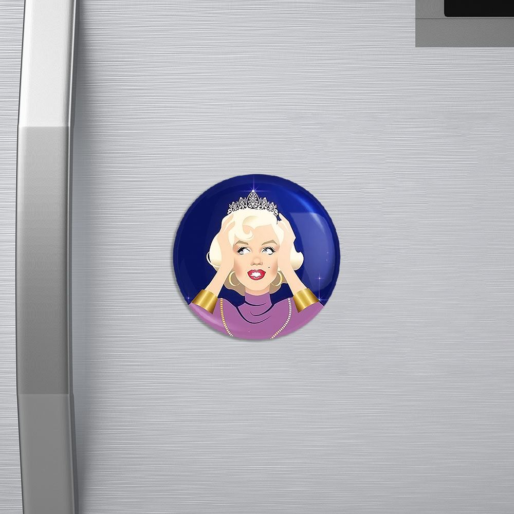 مگنت مرلین مونرو Marilyn Monroe خندالو با روکش سلفون مات مخملی ضدخش و قطعه پشتی فلزی تولید شده است که آهنربای اتمی بکار برده شده در محصول، بصورت مخفی تعبیه شده ودیده نمی شود. ضمن اینکه گیرایی بسیار بالایی داشته و به هیچ عنوان از روی یخچال نمی افتد.