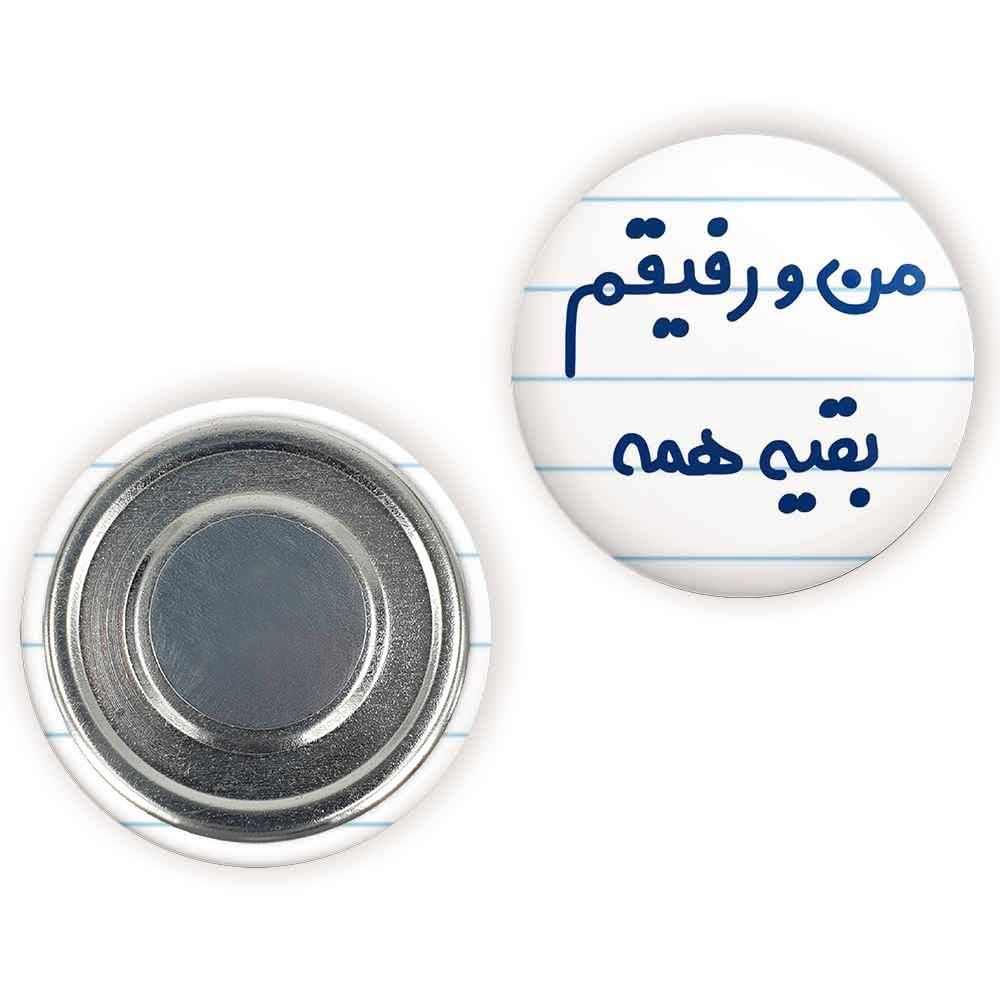 مگنت من و رفیقم بقیه همه خندالو با روکش سلفون مات مخملی ضدخش و قطعه پشتی فلزی تولید شده است که آهنربای اتمی بکار برده شده در محصول، بصورت مخفی تعبیه شده ودیده نمی شود. ضمن اینکه گیرایی بسیار بالایی داشته و به هیچ عنوان از روی یخچال نمی افتد.