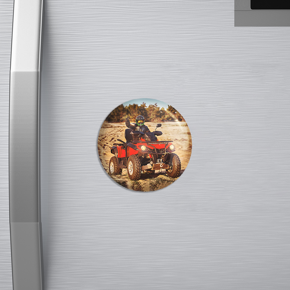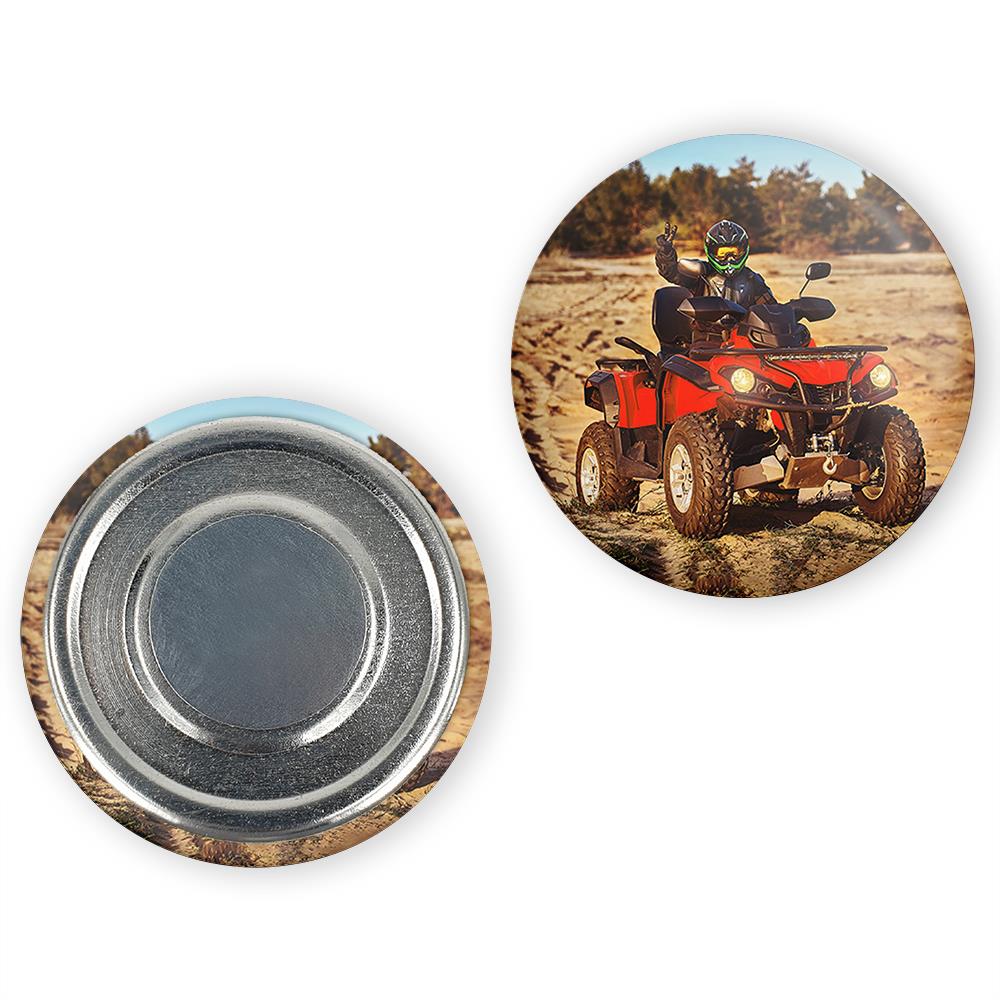 مگنت موتور چهار چرخ خندالو با روکش سلفون مات مخملی ضدخش و قطعه پشتی فلزی تولید شده است که آهنربای اتمی بکار برده شده در محصول، بصورت مخفی تعبیه شده ودیده نمی شود. ضمن اینکه گیرایی بسیار بالایی داشته و به هیچ عنوان از روی یخچال نمی افتد.