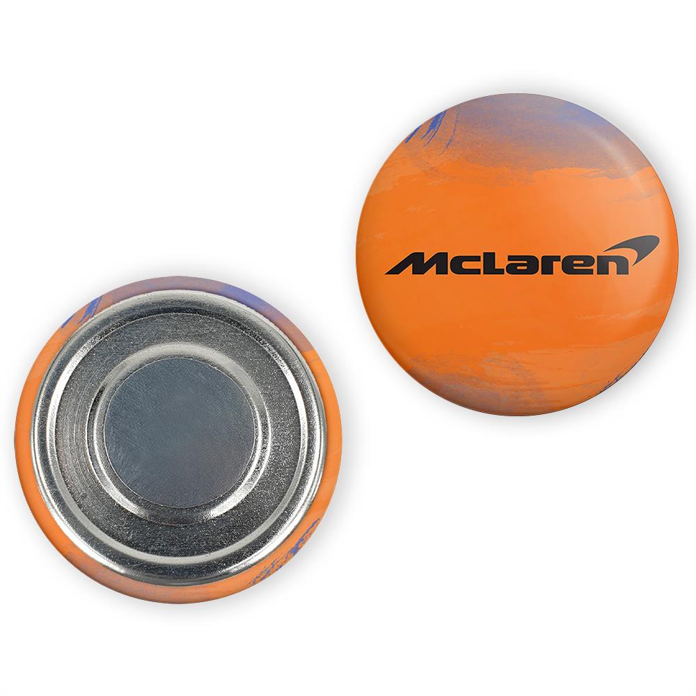 مگنت مک لارن Mclaren خندالو با روکش سلفون مات مخملی ضدخش و قطعه پشتی فلزی تولید شده است که آهنربای اتمی بکار برده شده در محصول، بصورت مخفی تعبیه شده ودیده نمی شود. ضمن اینکه گیرایی بسیار بالایی داشته و به هیچ عنوان از روی یخچال نمی افتد.