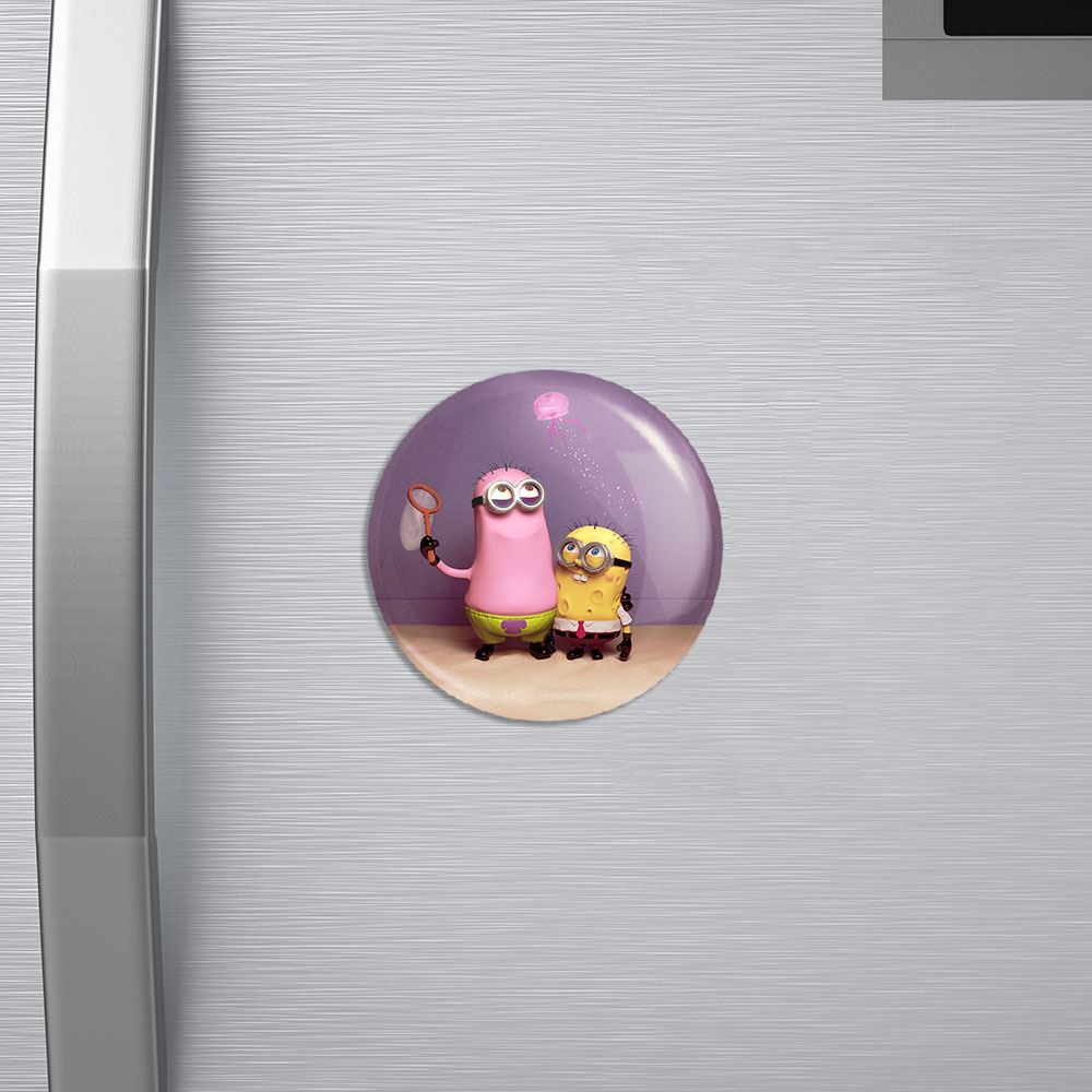 مگنت مینیون ها Minions خندالو با روکش سلفون مات مخملی ضدخش و قطعه پشتی فلزی تولید شده است که آهنربای اتمی بکار برده شده در محصول، بصورت مخفی تعبیه شده ودیده نمی شود. ضمن اینکه گیرایی بسیار بالایی داشته و به هیچ عنوان از روی یخچال نمی افتد.