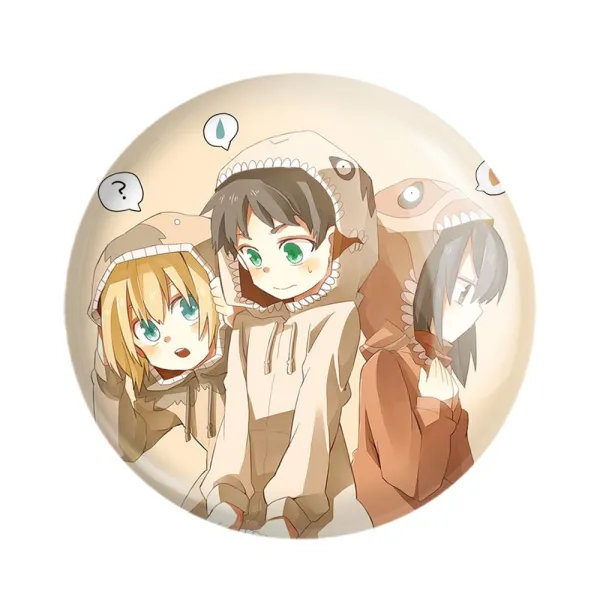 مگنت میکاسا و ارن و ارمین انیمه اتک آن تایتان Attack on Titan خندالو با روکش سلفون مات مخملی ضدخش و قطعه پشتی فلزی تولید شده است که آهنربای اتمی بکار برده شده در محصول، بصورت مخفی تعبیه شده ودیده نمی شود. ضمن اینکه گیرایی بسیار بالایی داشته و به هیچ عنوان از روی یخچال نمی افتد.