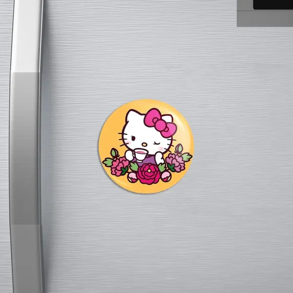 مگنت هلو کیتی Hello Kitty خندالو با روکش سلفون مات مخملی ضدخش و قطعه پشتی فلزی تولید شده است که آهنربای اتمی بکار برده شده در محصول، بصورت مخفی تعبیه شده ودیده نمی شود. ضمن اینکه گیرایی بسیار بالایی داشته و به هیچ عنوان از روی یخچال نمی افتد.