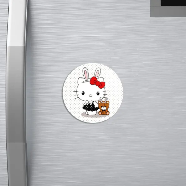 مگنت هلو کیتی Hello Kitty خندالو با روکش سلفون مات مخملی ضدخش و قطعه پشتی فلزی تولید شده است که آهنربای اتمی بکار برده شده در محصول، بصورت مخفی تعبیه شده ودیده نمی شود. ضمن اینکه گیرایی بسیار بالایی داشته و به هیچ عنوان از روی یخچال نمی افتد.