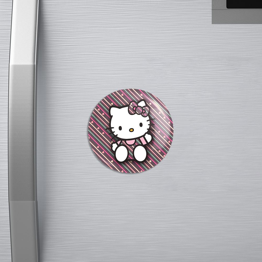 مگنت هلو کیتی Hello Kitty خندالو با روکش سلفون مات مخملی ضدخش و قطعه پشتی فلزی تولید شده است که آهنربای اتمی بکار برده شده در محصول، بصورت مخفی تعبیه شده ودیده نمی شود. ضمن اینکه گیرایی بسیار بالایی داشته و به هیچ عنوان از روی یخچال نمی افتد.