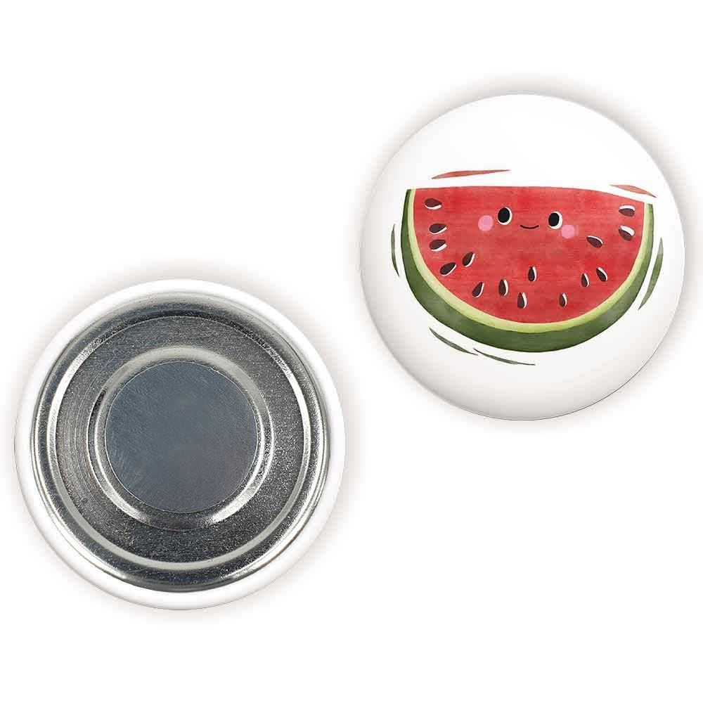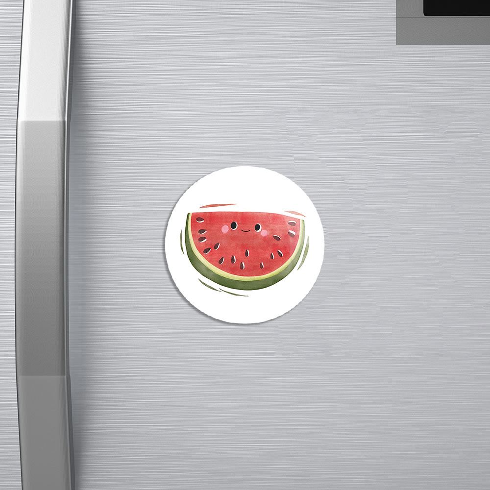 مگنت هندوانه خندالو با روکش سلفون مات مخملی ضدخش و قطعه پشتی فلزی تولید شده است که آهنربای اتمی بکار برده شده در محصول، بصورت مخفی تعبیه شده ودیده نمی شود. ضمن اینکه گیرایی بسیار بالایی داشته و به هیچ عنوان از روی یخچال نمی افتد.