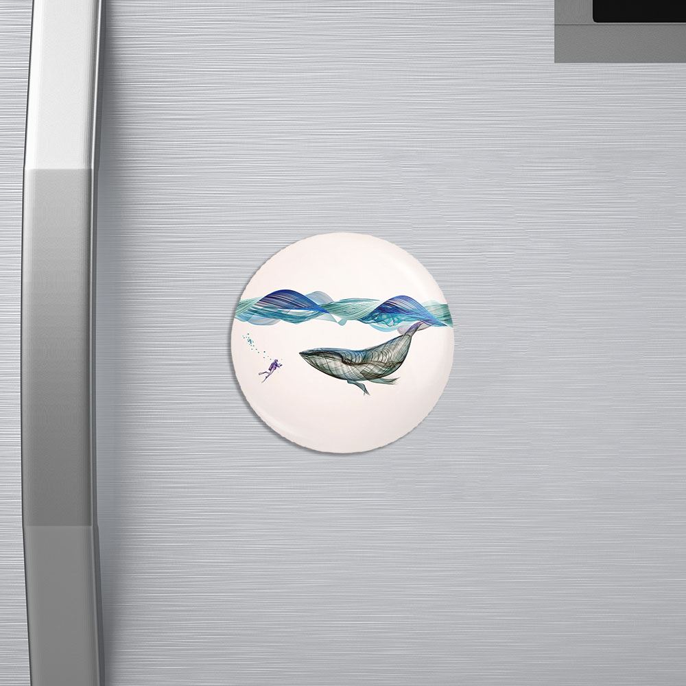 مگنت وال نهنگ خندالو با روکش سلفون مات مخملی ضدخش و قطعه پشتی فلزی تولید شده است که آهنربای اتمی بکار برده شده در محصول، بصورت مخفی تعبیه شده ودیده نمی شود. ضمن اینکه گیرایی بسیار بالایی داشته و به هیچ عنوان از روی یخچال نمی افتد.