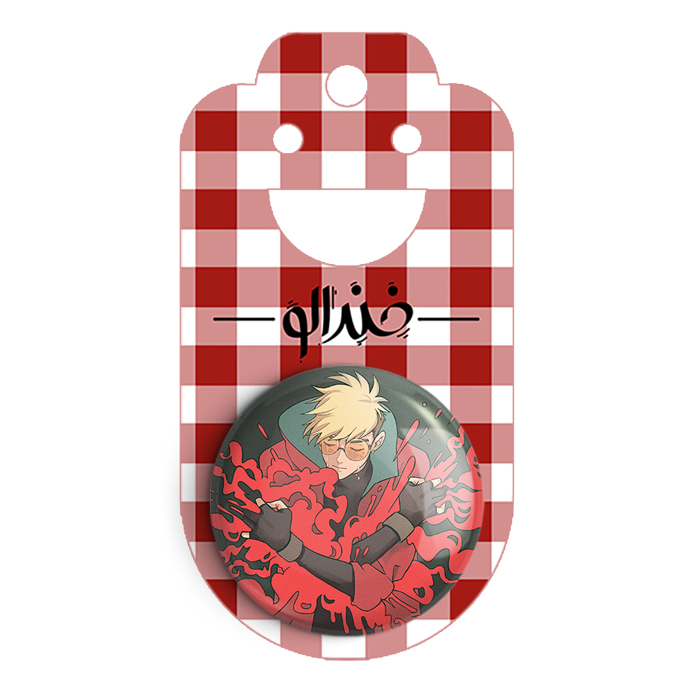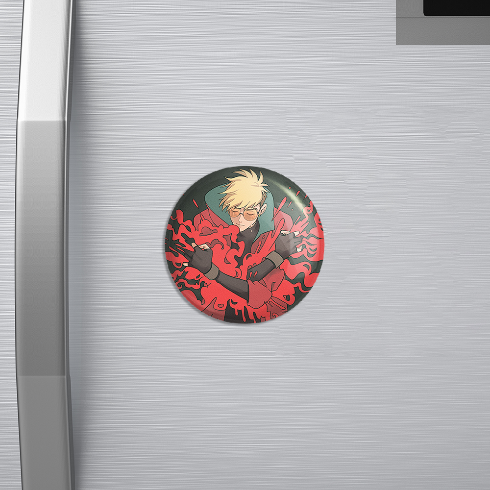 مگنت وش انیمه تریگان (Trigun) خندالو با روکش سلفون مات مخملی ضدخش و قطعه پشتی فلزی تولید شده است که آهنربای اتمی بکار برده شده در محصول، بصورت مخفی تعبیه شده ودیده نمی شود. ضمن اینکه گیرایی بسیار بالایی داشته و به هیچ عنوان از روی یخچال نمی افتد.