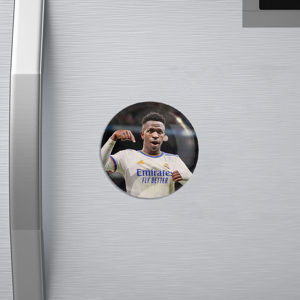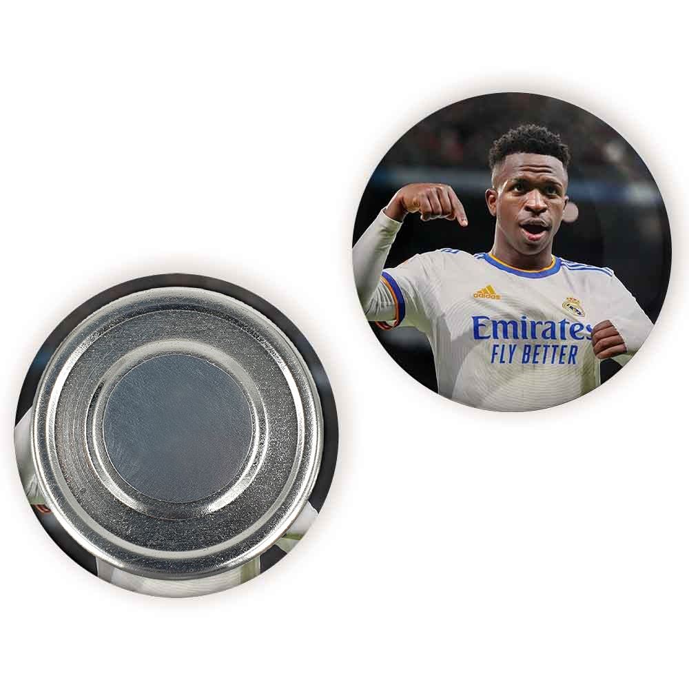 مگنت وینیسیوس جونیور Vini Jr خندالو با روکش سلفون مات مخملی ضدخش و قطعه پشتی فلزی تولید شده است که آهنربای اتمی بکار برده شده در محصول، بصورت مخفی تعبیه شده ودیده نمی شود. ضمن اینکه گیرایی بسیار بالایی داشته و به هیچ عنوان از روی یخچال نمی افتد.