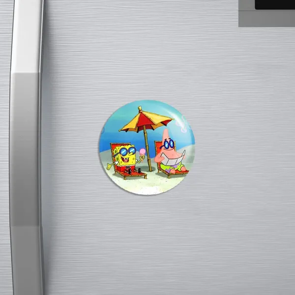 مگنت پاتریک و باب اسفنجی خندالو با روکش سلفون مات مخملی ضدخش و قطعه پشتی فلزی تولید شده است که آهنربای اتمی بکار برده شده در محصول، بصورت مخفی تعبیه شده ودیده نمی شود. ضمن اینکه گیرایی بسیار بالایی داشته و به هیچ عنوان از روی یخچال نمی افتد.