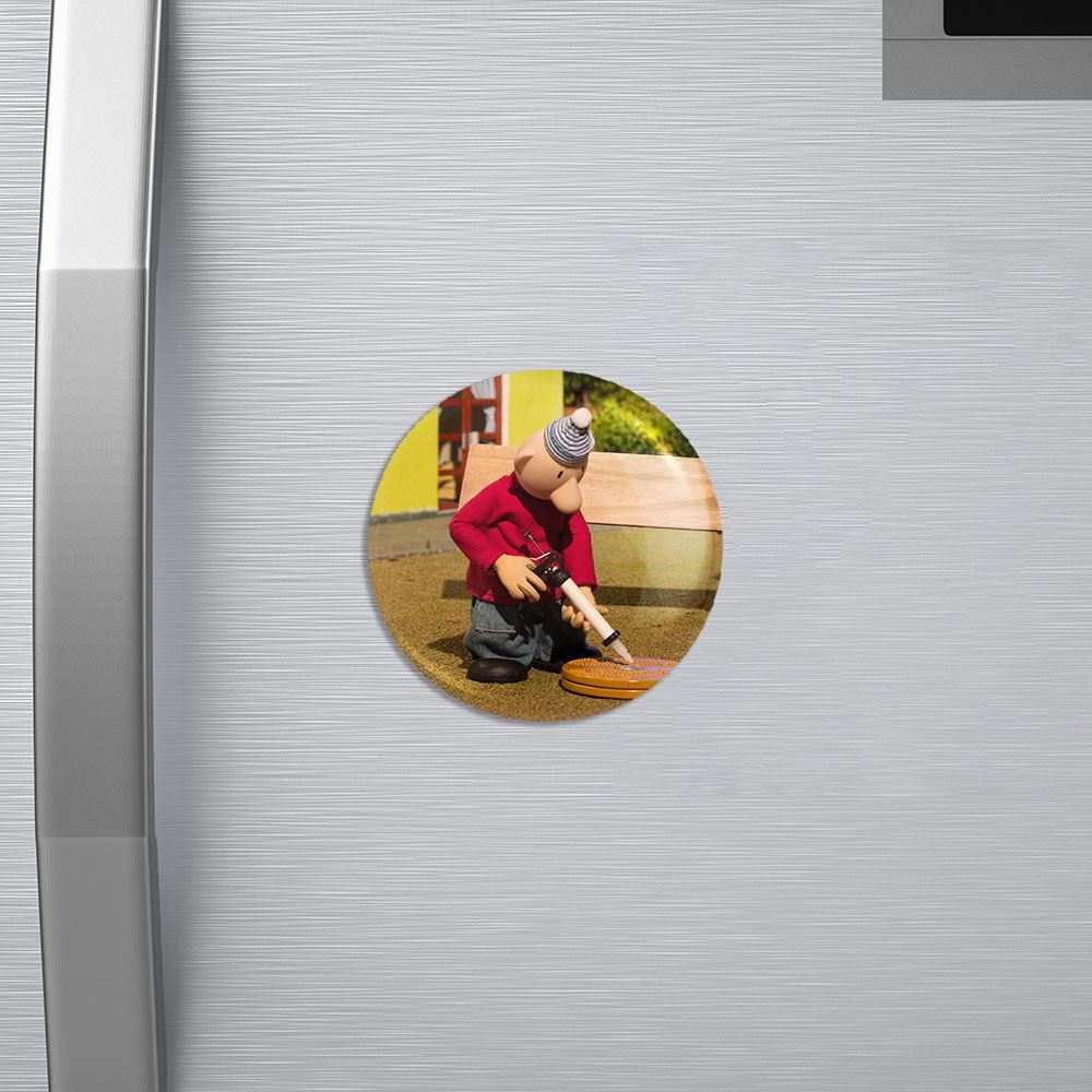 مگنت پت و مت خندالو با روکش سلفون مات مخملی ضدخش و قطعه پشتی فلزی تولید شده است که آهنربای اتمی بکار برده شده در محصول، بصورت مخفی تعبیه شده ودیده نمی شود. ضمن اینکه گیرایی بسیار بالایی داشته و به هیچ عنوان از روی یخچال نمی افتد.