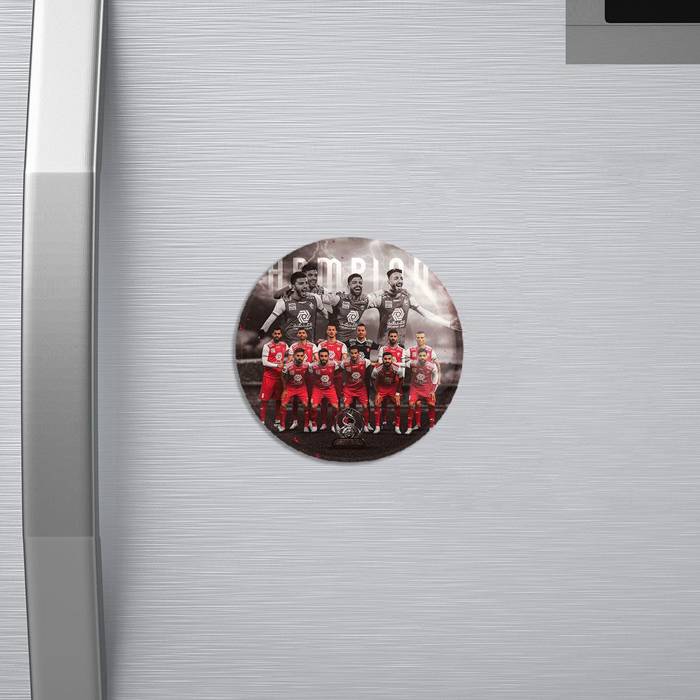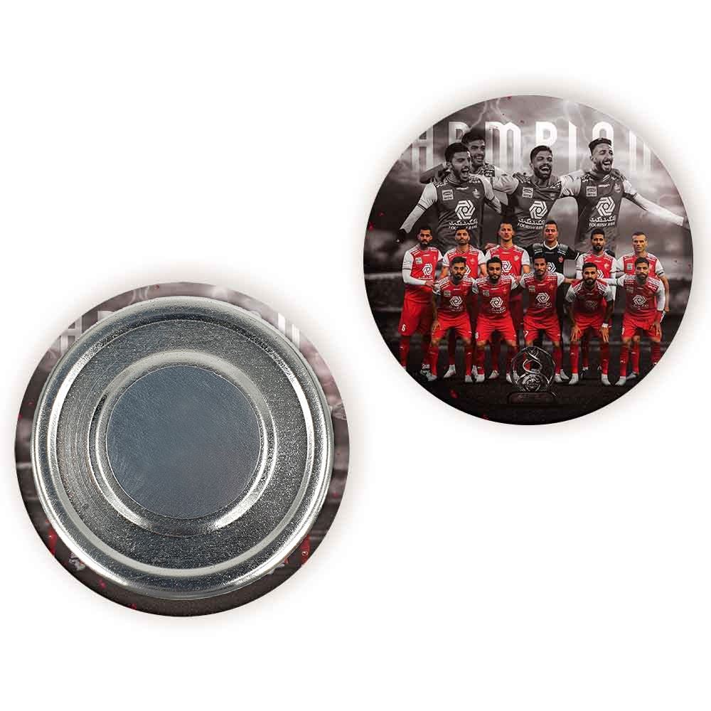 مگنت پرسپولیس خندالو با روکش سلفون مات مخملی ضدخش و قطعه پشتی فلزی تولید شده است که آهنربای اتمی بکار برده شده در محصول، بصورت مخفی تعبیه شده ودیده نمی شود. ضمن اینکه گیرایی بسیار بالایی داشته و به هیچ عنوان از روی یخچال نمی افتد.
