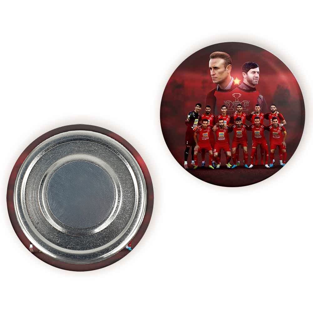 مگنت پرسپولیس خندالو با روکش سلفون مات مخملی ضدخش و قطعه پشتی فلزی تولید شده است که آهنربای اتمی بکار برده شده در محصول، بصورت مخفی تعبیه شده ودیده نمی شود. ضمن اینکه گیرایی بسیار بالایی داشته و به هیچ عنوان از روی یخچال نمی افتد.
