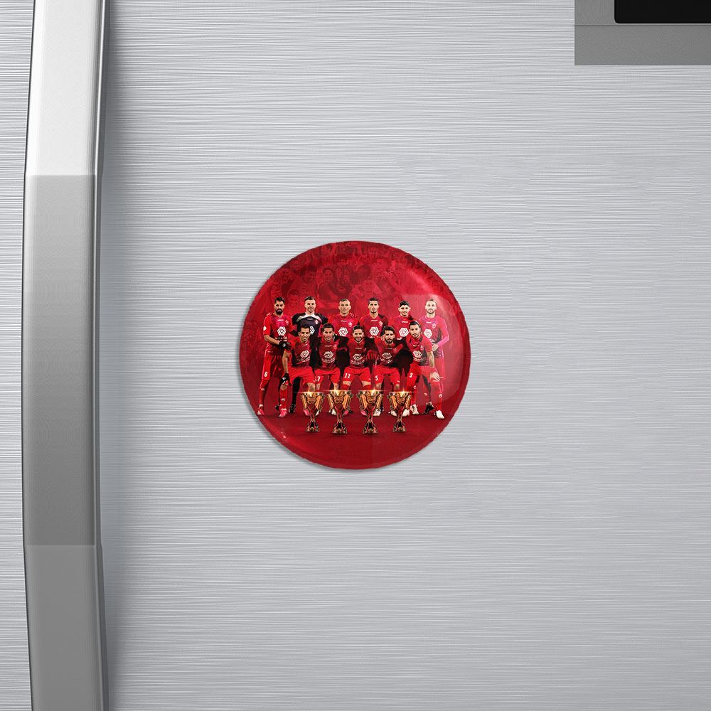 مگنت پرسپولیس خندالو با روکش سلفون مات مخملی ضدخش و قطعه پشتی فلزی تولید شده است که آهنربای اتمی بکار برده شده در محصول، بصورت مخفی تعبیه شده ودیده نمی شود. ضمن اینکه گیرایی بسیار بالایی داشته و به هیچ عنوان از روی یخچال نمی افتد.