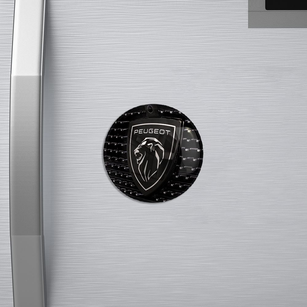 مگنت پژو Peugeot خندالو با روکش سلفون مات مخملی ضدخش و قطعه پشتی فلزی تولید شده است که آهنربای اتمی بکار برده شده در محصول، بصورت مخفی تعبیه شده ودیده نمی شود. ضمن اینکه گیرایی بسیار بالایی داشته و به هیچ عنوان از روی یخچال نمی افتد.